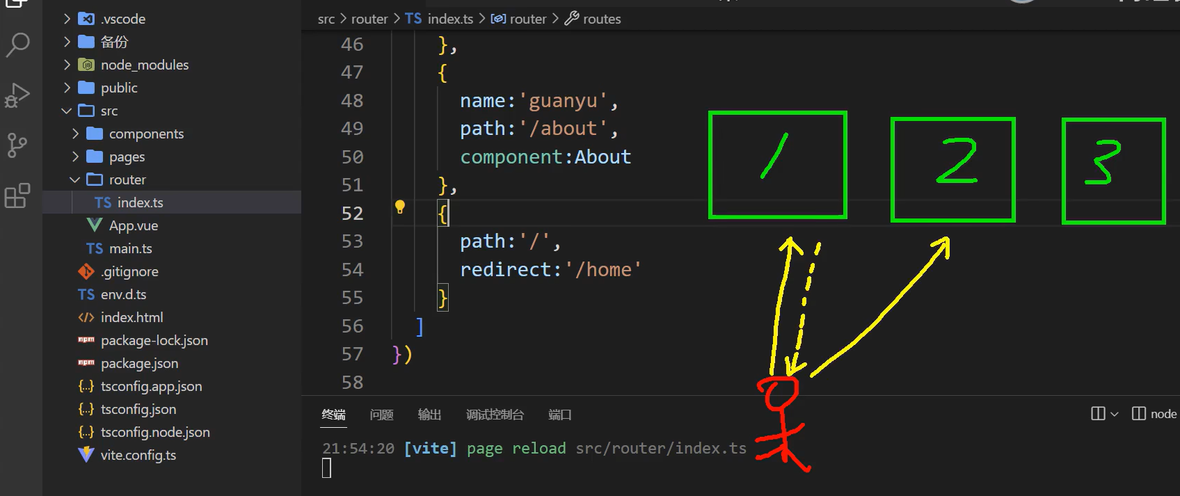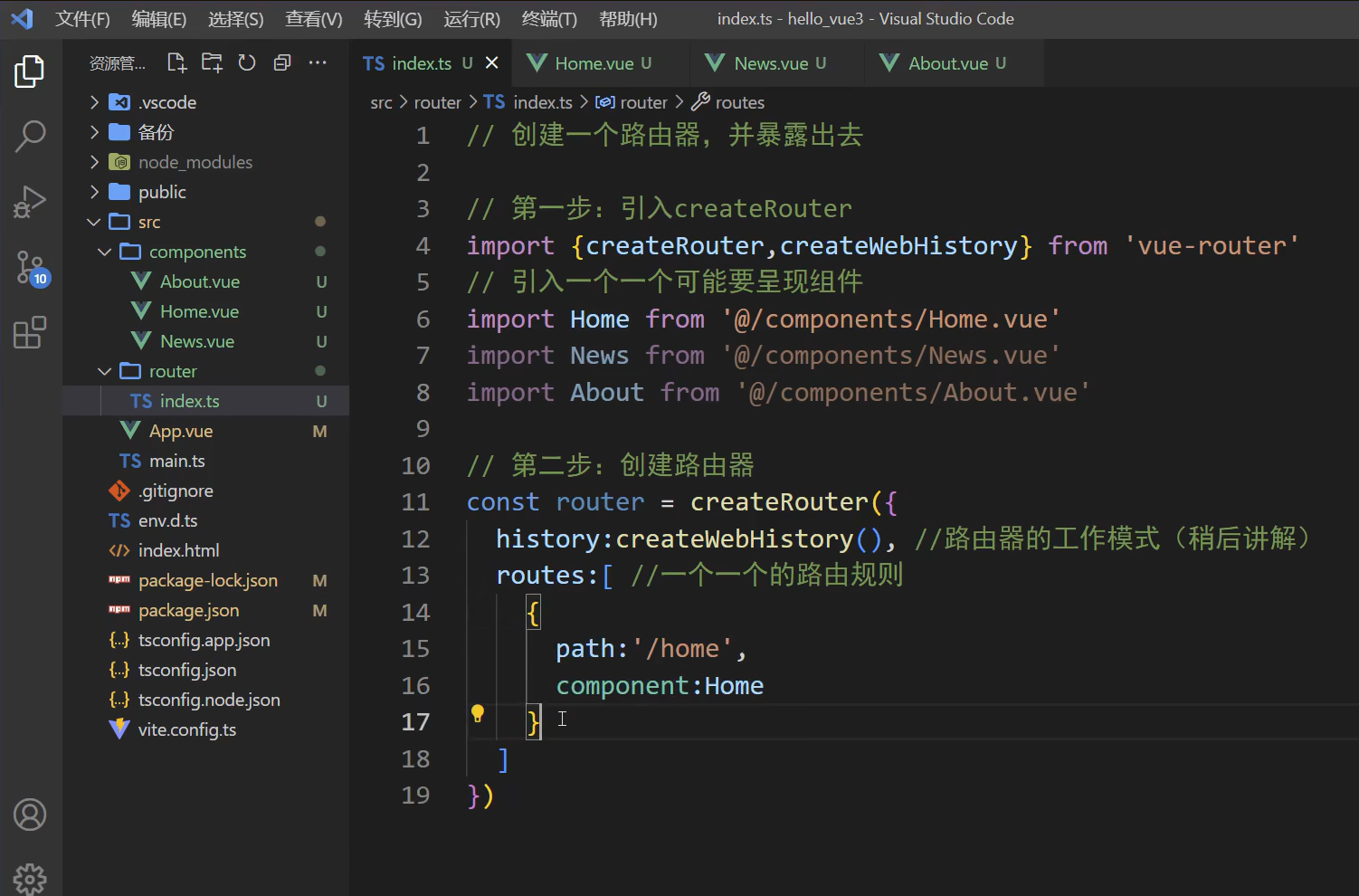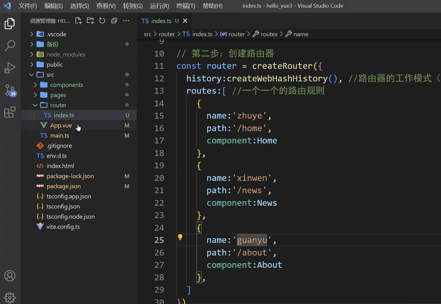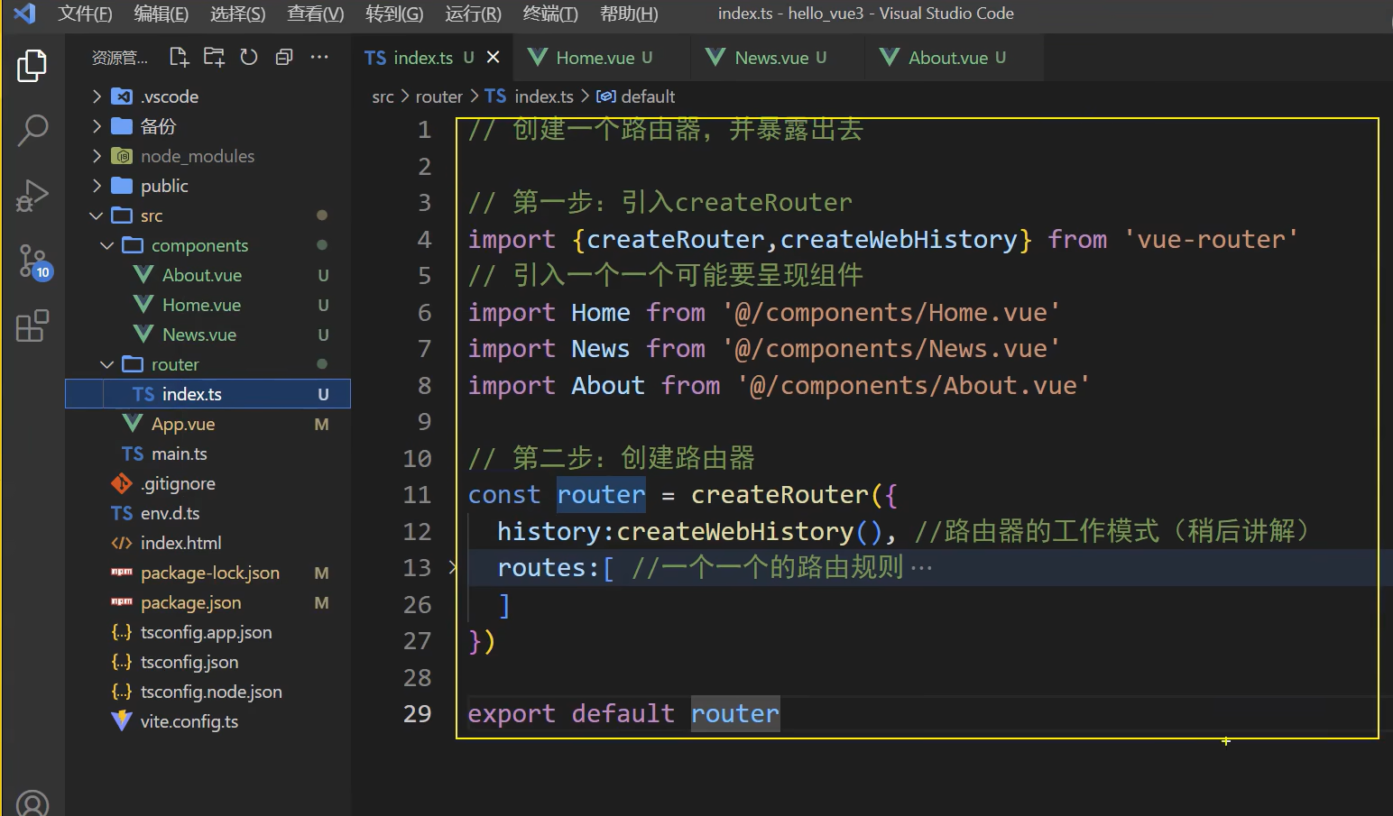 // router/index.jsimport { createRouter, createWebHistory } from 'vue-router'import Home from '../views/Home.vue'import About from '../views/About.vue'const routes = [{path: '/', // 访问的路径name: 'Home', // 路由名称(可选)component: Home // 要渲染的组件},{path: '/about',name: 'About',component: About}]const router = createRouter({history: createWebHistory(), // 指定历史模式routes // 路由规则配置})export default router