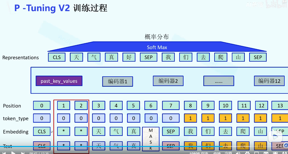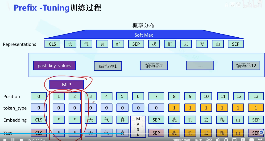 在Prompt-tunning的基础上,embeding之后加入一个MLP层,在编码器部分加上一个Past_KV