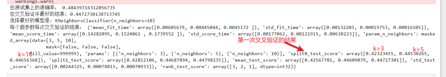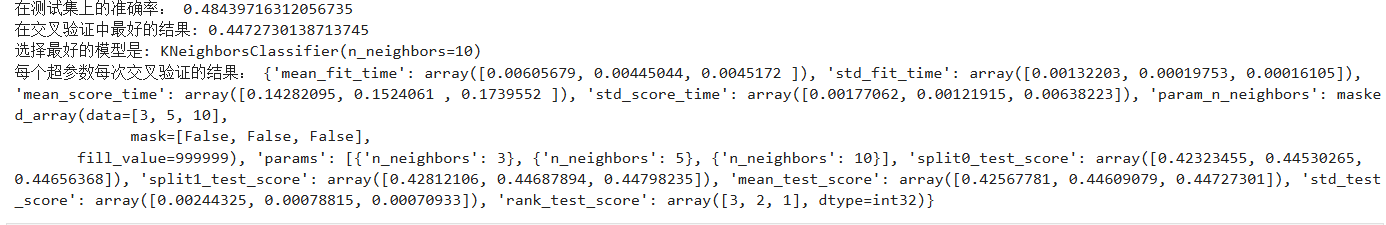 from sklearn.metrics import accuracy_scoredef knncls():"""K-近邻预测用户签到位置:return:None"""# 读取数据data = pd.read_csv('train.csv')test = pd.read_csv('test.csv')# 处理数据# 1.缩小数据,查询数据筛选# x,y刚好返回一个正方形data=data.query("x>1.0 & x<1.25 & y>2.5 &y<2.75")# 处理时间的数据,将时间戳数据转换为可读的日期时间格式,指定时间戳的单位是秒(seconds)time_value=pd.to_datetime(data['time'],unit='s')# 把日期转换为字典格式time_value=pd.DatetimeIndex(time_value)# 构造一些特征data['day']=time_value.daydata['hour']=time_value.hourdata['weekday']=time_value.weekday# 把时间戳特征删除,按列操作data=data.drop(['time'],axis=1) # 把签到数量少于n个的目标位置删除place_count=data.groupby('place_id').count()tf=place_count[place_count.row_id>3].reset_index() #reset_index重新索引data=data[data['place_id'].isin(tf.place_id)]# 删除 row_id 列if 'row_id' in data.columns:data = data.drop(['row_id'], axis=1)# 取出数据当中的特征值和目标值x=data.drop(['place_id'],axis=1)y=data['place_id']# 进行数据的分割,分割成训练集和测试集x_train,x_test,y_train,y_test=train_test_split(x,y,test_size=0.25,random_state=42)# 特征工程(标准化)scaler = StandardScaler()x_train = scaler.fit_transform(x_train)x_test = scaler.transform(x_test)# 进行算法流程knn=KNeighborsClassifier(n_neighbors=5)knn.fit(x_train,y_train)# 得出预测结果y_predict=knn.predict(x_test)print("预测的目标签到位置为:",y_predict)# 得出准确率print("预测的准确率:",knn.score(x_test,y_test))if __name__=="__main__":knncls()输出: