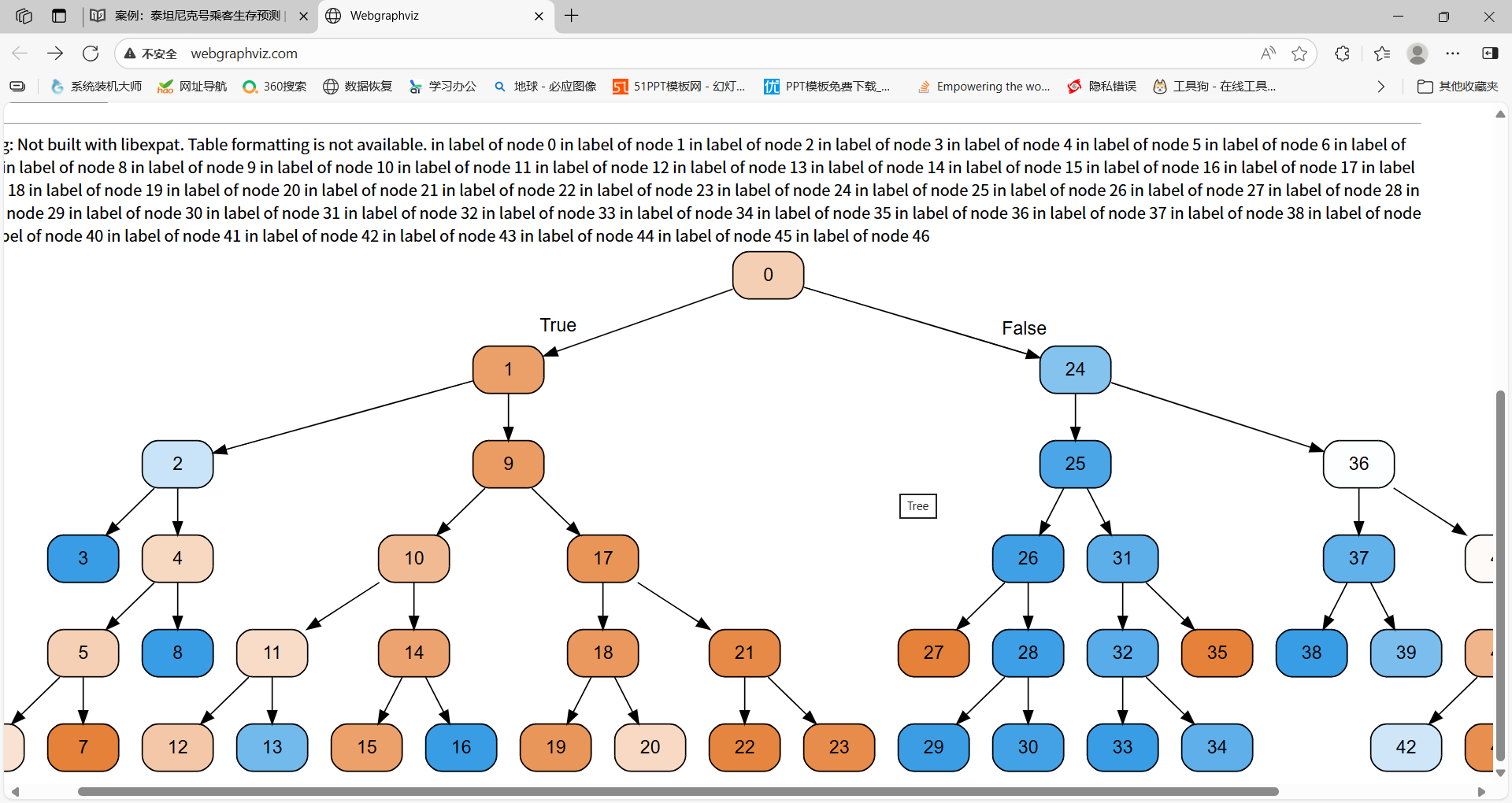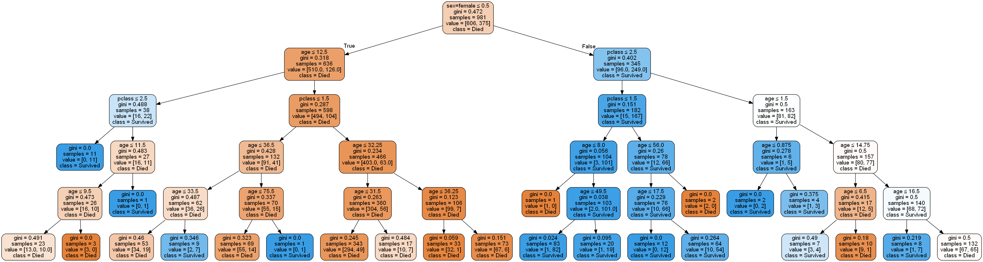 from sklearn.tree import export_graphvizdef decision():"""决策树对泰坦尼克号进行生死预测(将 pclass 也视为类别特征并 one-hot)"""# 1) 读取数据titan = pd.read_csv("titanic3.csv")# 2) 选择特征与标签x = titan[['pclass', 'age', 'sex']].copy()y = titan['survived']# 3) 缺失值处理x['age'] = x['age'].fillna(x['age'].mean())# 4) 将 pclass 当作分类特征(转为字符串或 category 都行)x['pclass'] = x['pclass'].astype('category') # 或者 .astype(str)# 5) 切分数据x_train, x_test, y_train, y_test = train_test_split(x, y, test_size=0.25, random_state=42, stratify=y)# 6) One-hot:DictVectorizer(会对字符串/分类列做 one-hot,对数值列保持原样)vec = DictVectorizer(sparse=False)x_train_enc = vec.fit_transform(x_train.to_dict(orient="records"))x_test_enc = vec.transform(x_test.to_dict(orient="records"))# 看看最终特征名(应包含 pclass=1/2/3 与 sex=female/male)feature_names = vec.get_feature_names_out()print("特征名:", feature_names)# 7) 决策树训练与评估clf = DecisionTreeClassifier(criterion="gini", max_depth=5, random_state=42)clf.fit(x_train_enc, y_train)y_pred = clf.predict(x_test_enc)print("Accuracy:", accuracy_score(y_test, y_pred))print(classification_report(y_test, y_pred))# 8)(可选)特征重要性importances = pd.Series(clf.feature_importances_, index=feature_names).sort_values(ascending=False)print("特征重要性:")print(importances)# 9) 导出为 .dot,并渲染为 PNGdot_data = export_graphviz(clf,out_file=None,feature_names=feature_names,class_names=["Died", "Survived"],filled=True, rounded=True, special_characters=True)# 写入 .dot 文件with open("titanic_tree.dot", "w", encoding="utf-8") as f:f.write(dot_data)print("已保存:titanic_tree.dot")# 用 graphviz 在 Jupyter 中直接渲染gragh=graphviz.Source(dot_data)display(gragh)gragh.render(filename="titanic_tree", format="png", cleanup=True)print("已保存为 titanic_tree.png 文件")return graghif __name__ == "__main__":decision()