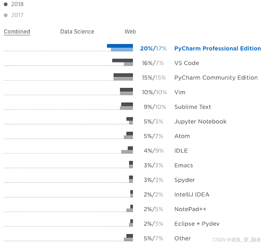 虽然交互式解释器可以执行Python代码,但编写代码时并不方便。因此,我们需要更专业的开发工具来编写Python程序。网上了解到之前的业界常用的Python开发工具主要包括以下几种,现在是VS Code占大头了: