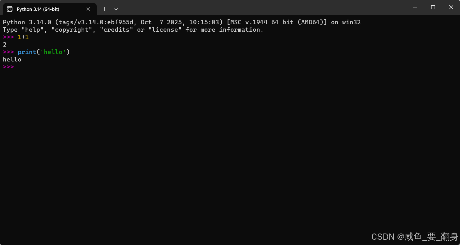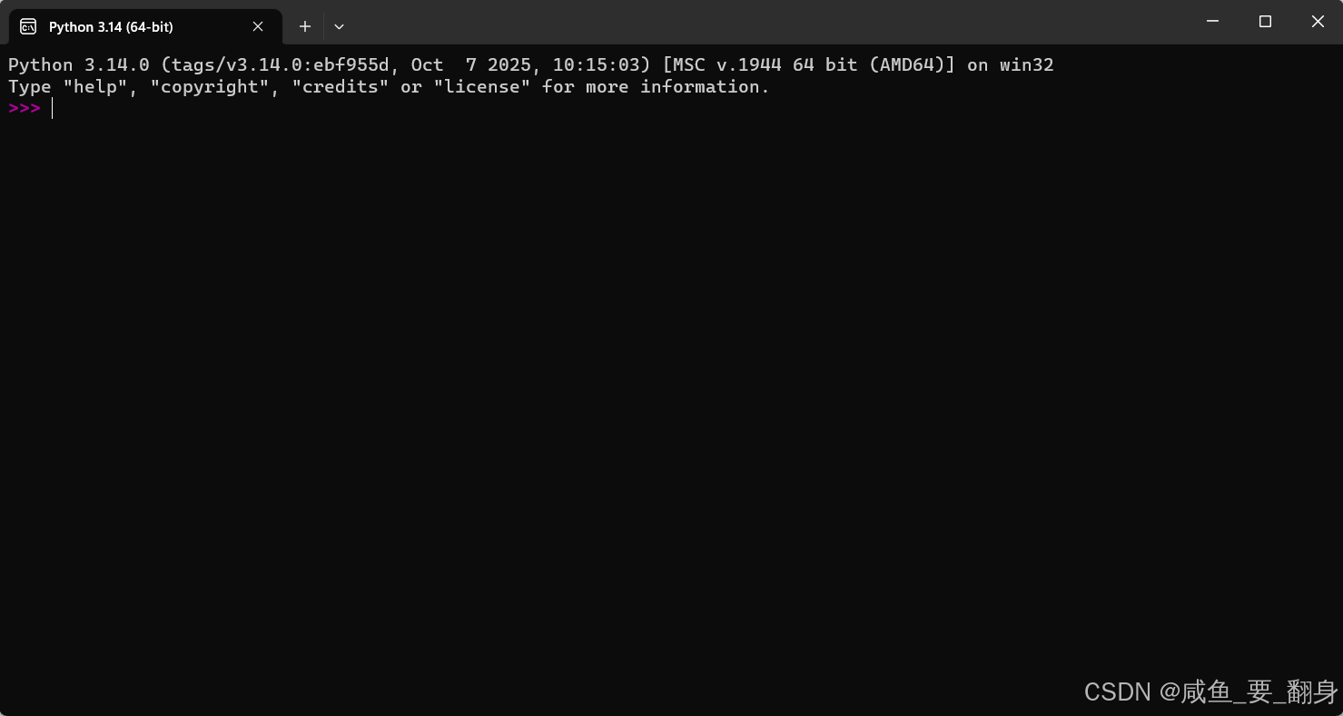 关键就在于这个 python 3.14 文件(第二个)。它是运行 Python 程序的核心组件。双击 python.exe 会启动 Python 交互式解释器(一个控制台程序),在这里可以输入 Python 代码。如下: