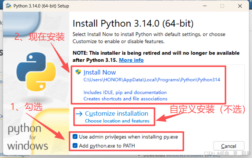 双击下载的.exe应用程序开始安装。建议勾选"Add Python.exe to PATH"和使用管理员用户下载(Use admin privileges when installing py.exe)这两个选项,并将Python的安装路径记录下来以备后续使用。然后点击"Install Now"。