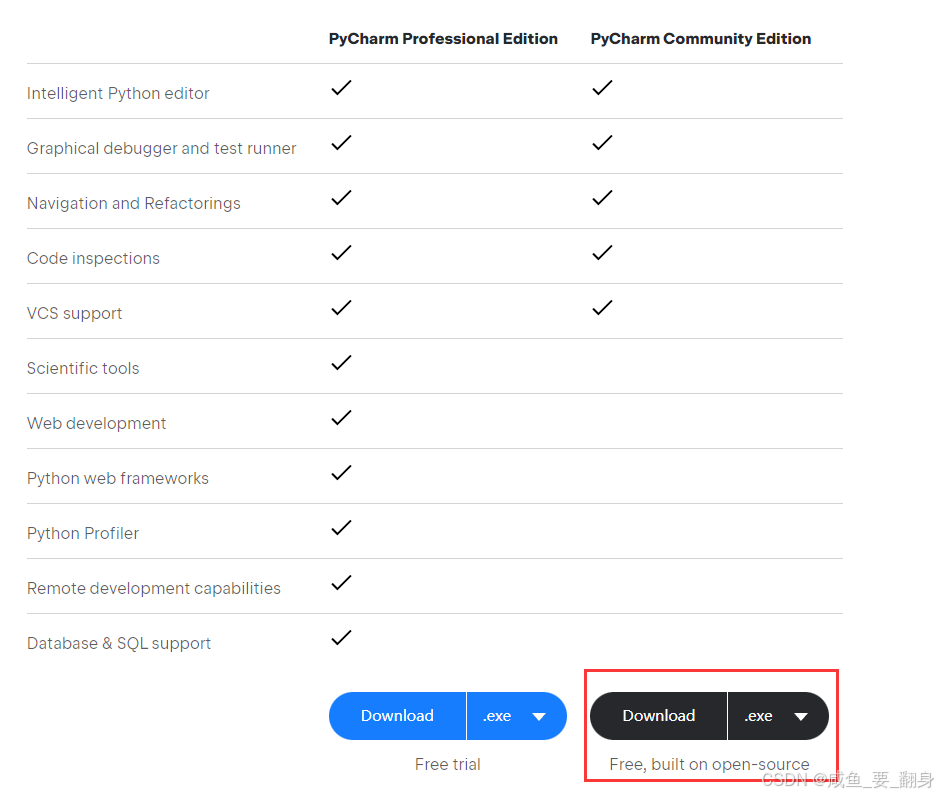 点击方框标记的位置即可下载。需要说明的是,PyCharm 提供三个版本:
