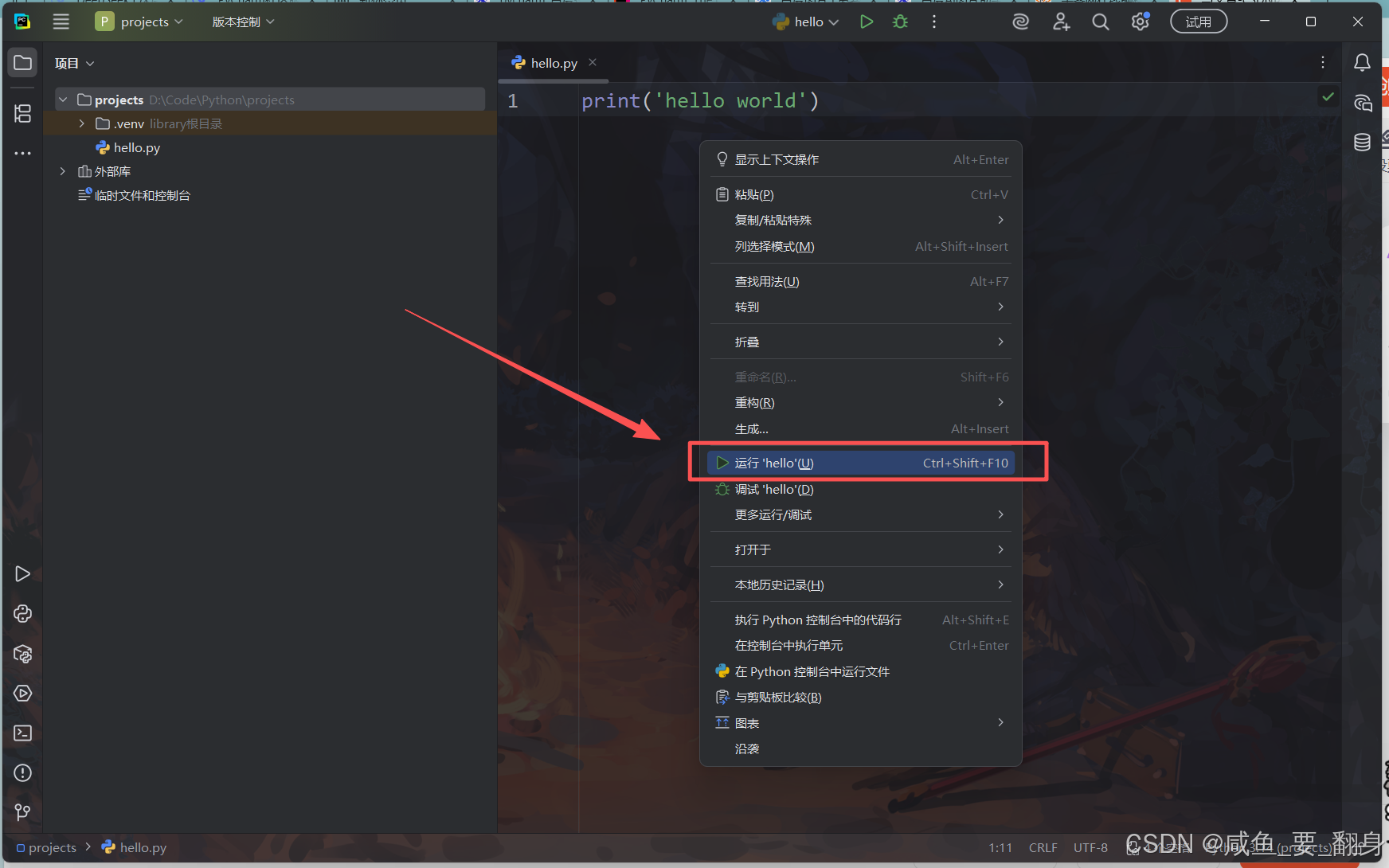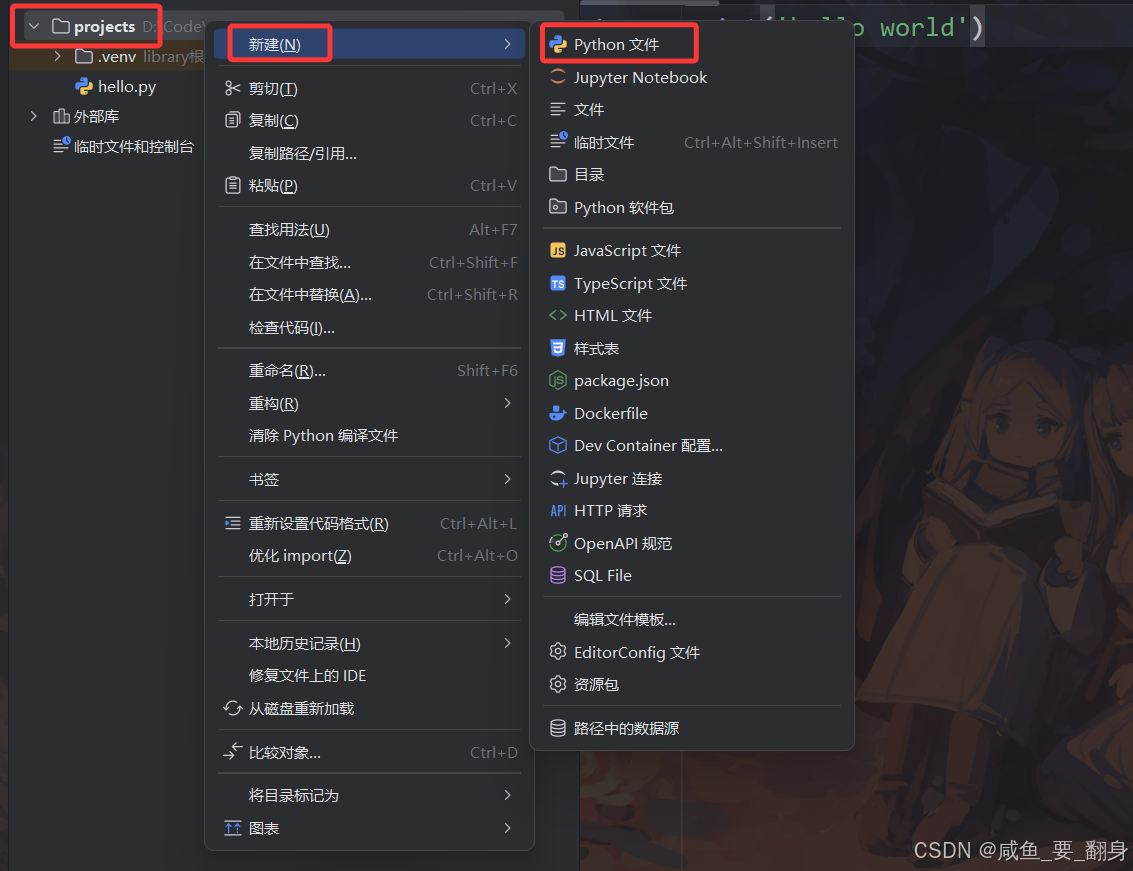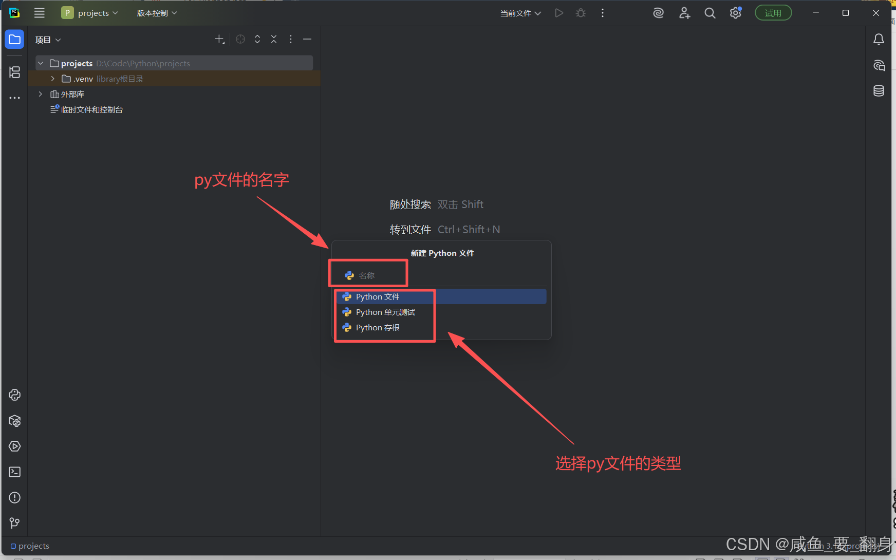 在左侧的项目目录上右键单击,选择 New -> Python File。