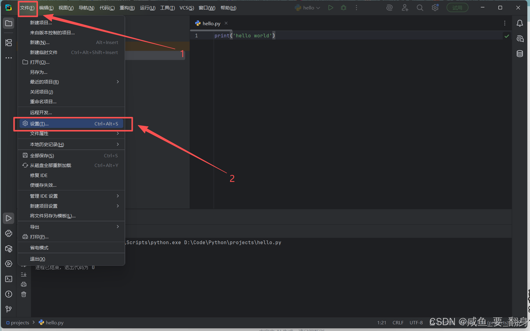 PyCharm 的默认字体偏小,长时间使用容易造成眼睛疲劳。建议适当调大字体:依次点击 File -> Settings 进行设置。