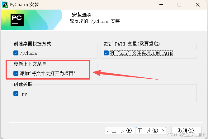 推荐勾选圈住的这个选项(其他选项可以自行选择),这样在任何文件夹右键点击时,都能直接通过 PyCharm 打开该目录。