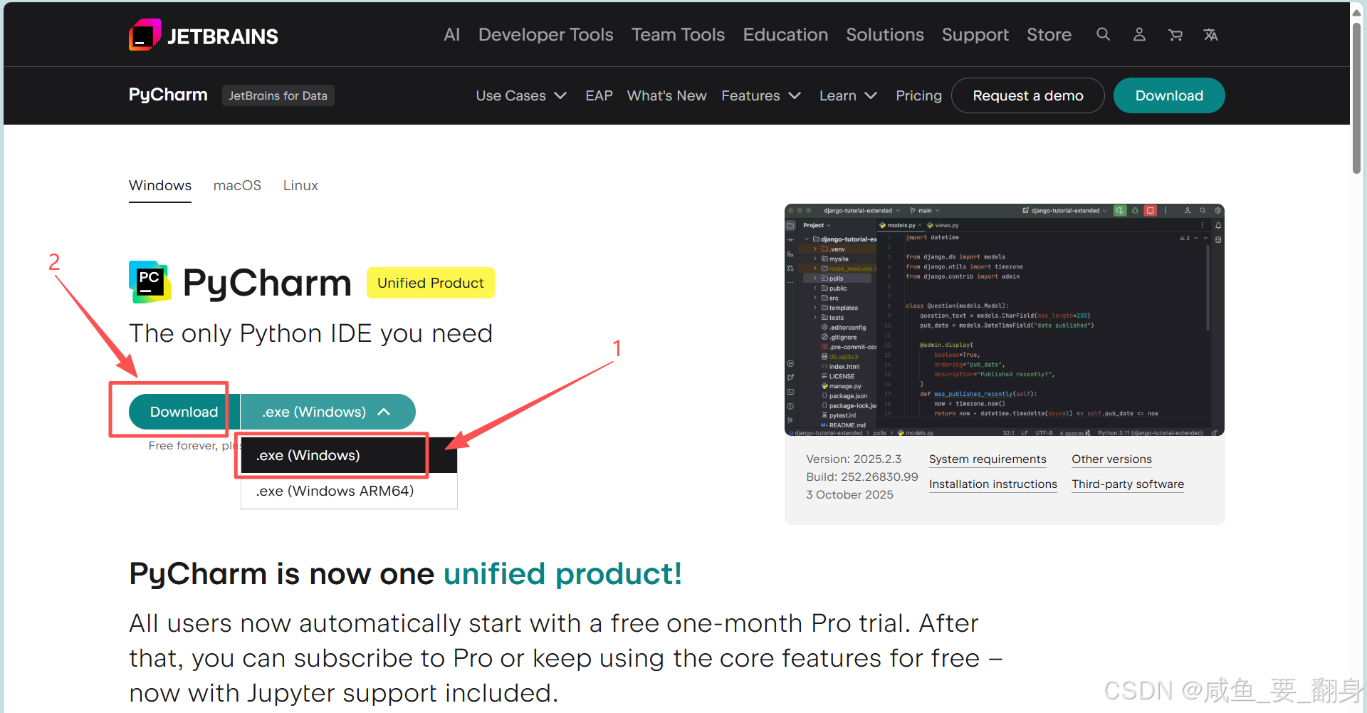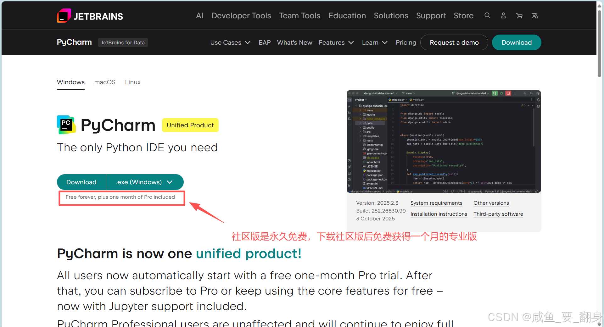 根据JetBrains官方发布的信息,从PyCharm 2025.1版本开始,原先独立的社区版和专业版已经合并为一个统一的PyCharm产品!!!所以现在已经不区分社区版和专业版了!!!