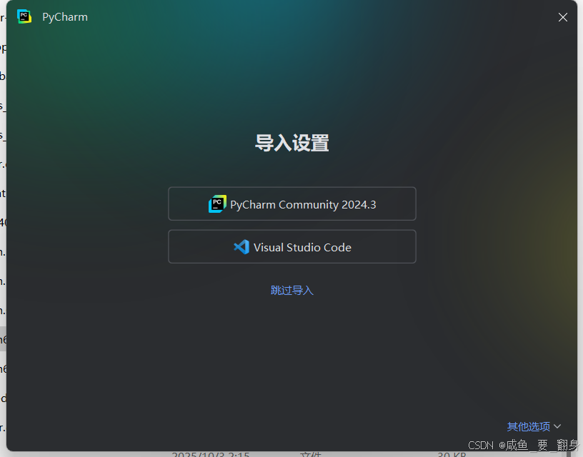 如果之前有安装过关于py的开发工具的话,会弹出如下的设置窗口,如果我们不想导入的话就直接跳过: