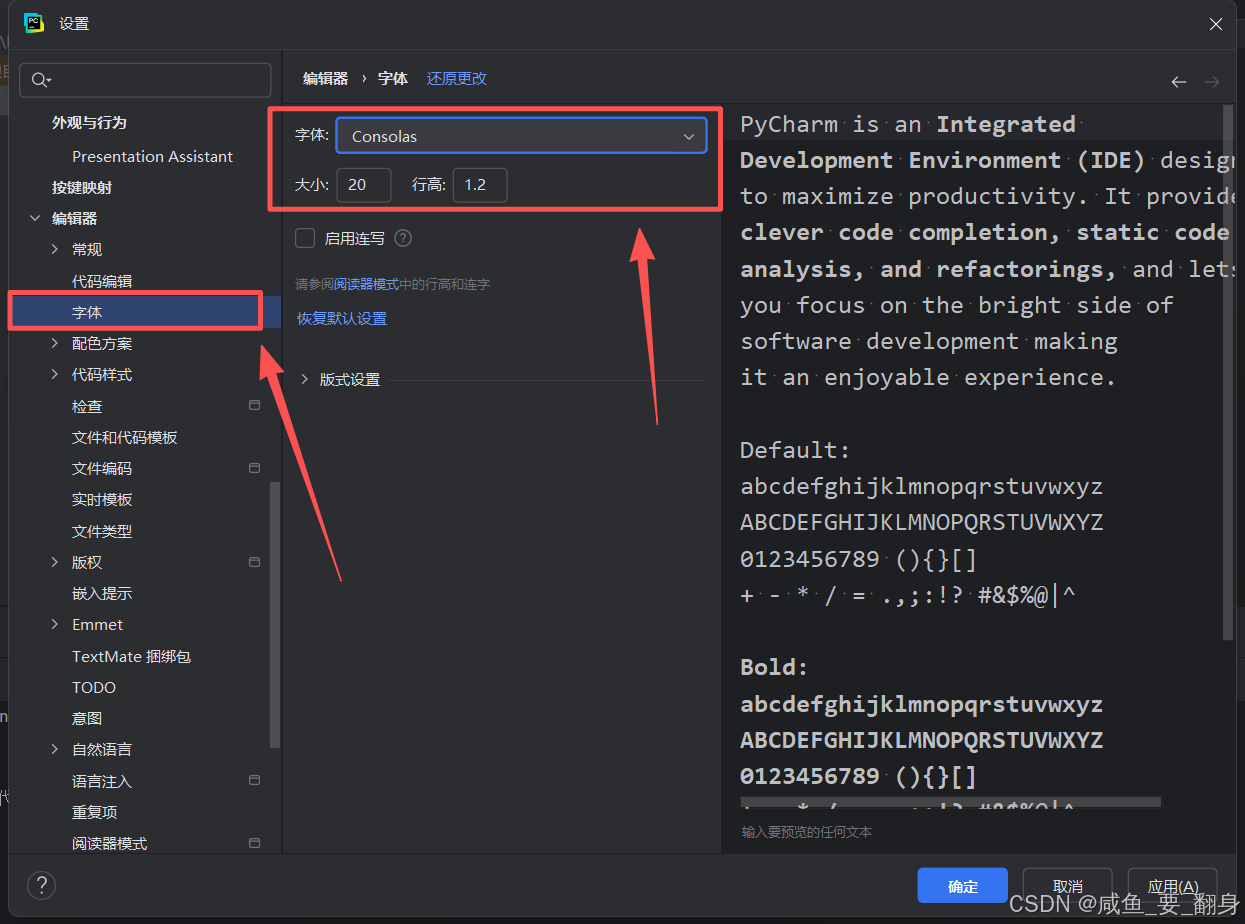 在 Editor -> Font 选项中,可以调整以下两个参数: