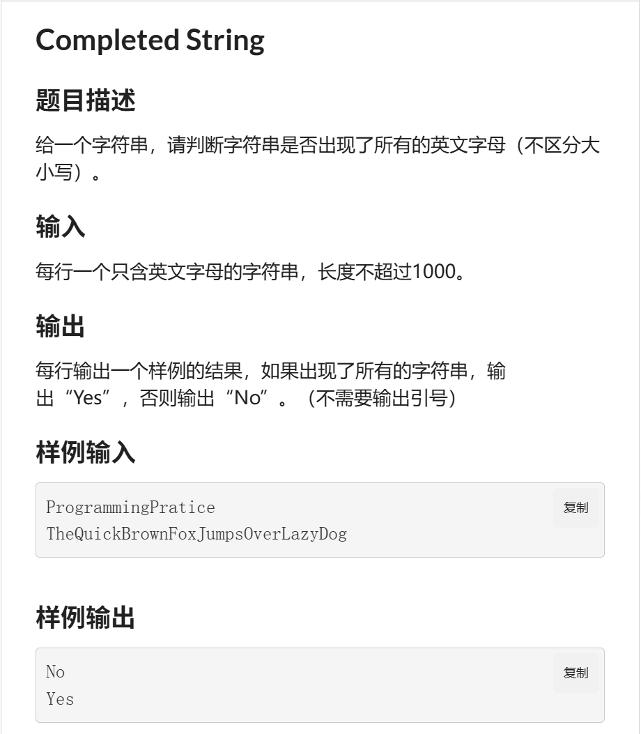 由于输入既有大小又有小写,然后题目说不区分大小写,一般小写通常比大小多,不妨把所有的大写都转换成小写。然后再统计是不是有字母没出现过,如果有,就可以立马判断No,如果循环结束都没判断为No,则输出Yes,这里我用一个flag来记录。