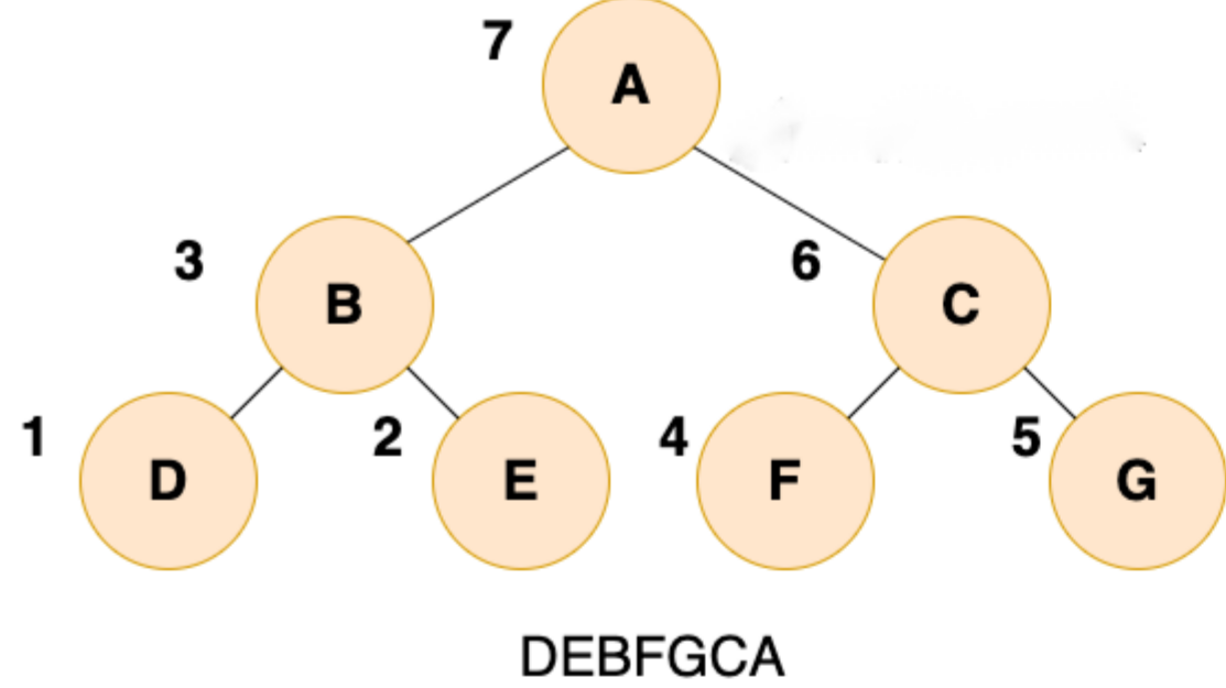 后序遍历:左子树->右子树->根结点(左->右->根)