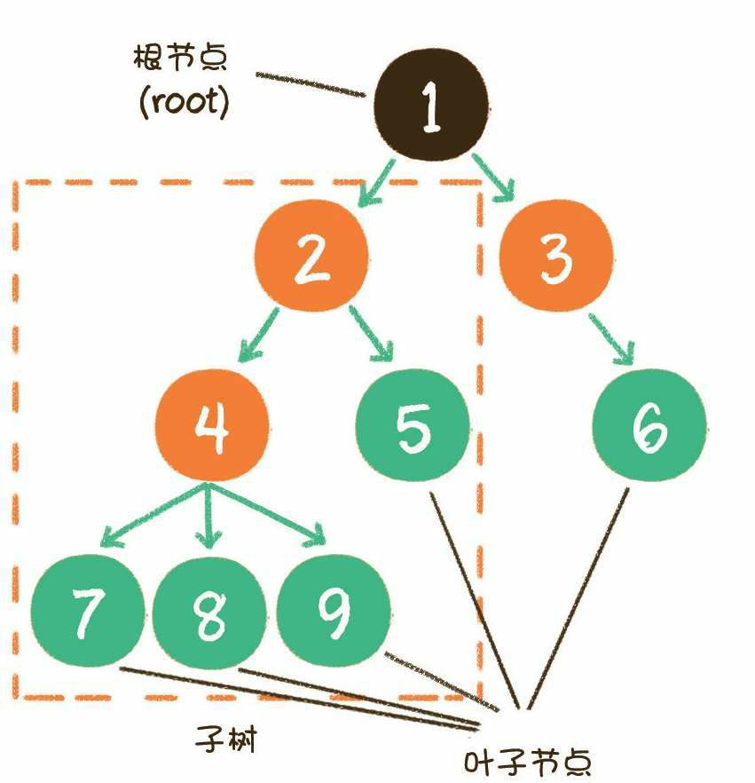 - 子树:由某个子结点作为根结点组成的树被称为子树。例如:结点2是根结点1的其中一个子树根结点。