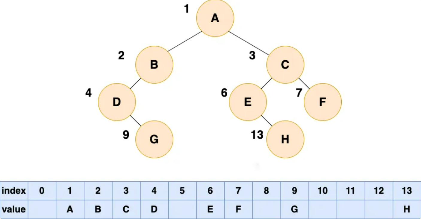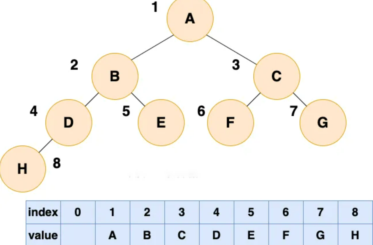 - 父结点和子结点的序号有对应关系,当根结点的序号值为 1 的情况下,若父结点的序号是 i,那么左子结点的序号就是 2i,右子结点的序号是 2i+1。