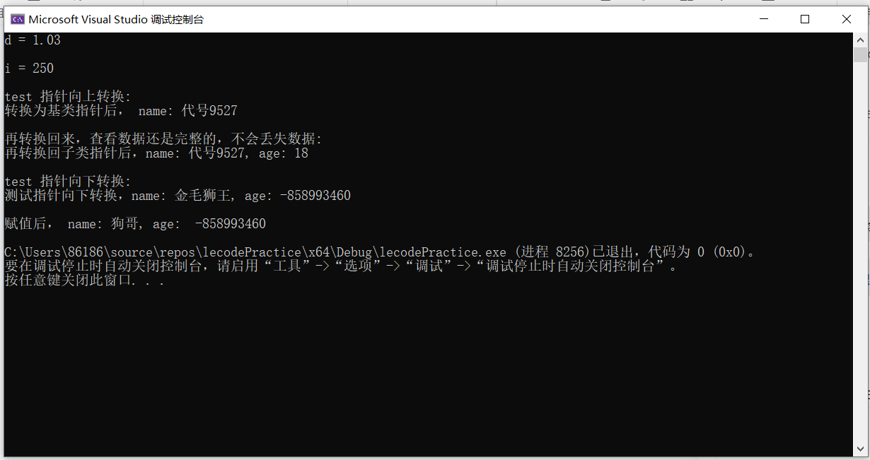 void testTypeCast(void) {// test static_cast 静态转换,即编译期间转换// 1、基本数据类型转换float f = 1.03;double d = (double)f;d = static_cast<double> (f);std::cout << "d = " << d << endl << endl; // d = 1.03// 转换失败则编译报错//int* p = static_cast<int*> (f); // 编译报错:类型转化无效。// 2、void指针和其他类型指针转换int i = 9527;int* p = &i;void* p2 = static_cast<void*>(p);unsigned* p3 = static_cast<unsigned*>(p2);*p3 = 250;std::cout << "i = " << i << endl << endl; // i = 250//char* c = static_cast<char*>(p3); // 编译报错:类型转化无效。// 3、指针或引用的向上转化class Base {public:string name;virtual void func() {std::cout << "调用基类func函数, name: " << name << endl;}};class Sub : public Base {public:int age;Sub() :age(0) {}void func() override {std::cout << "调用子类func函数, name: " << name << ",age: " << age << endl;}int getAge() const {return age;}};Sub sub;sub.name = "代号9527";sub.age = 18;// 向上转换std::cout << "test 指针向上转换:" << endl;Base* basePtr = static_cast<Base*>(&sub);std::cout << "转换为基类指针后, name: " << basePtr->name << endl << endl; // 转换为基类指针后, name: 代号9527std::cout << "再转换回来,查看数据还是完整的,不会丢失数据:" << endl;Sub* subPtr = static_cast<Sub*>(basePtr);std::cout << "再转换回子类指针后,name: " << subPtr->name << ", age: " << subPtr->age << endl << endl; // 再转换回子类指针后,name: 代号9527, age: 18// 再测试下,指针类型向下转换是否可以std::cout << "test 指针向下转换:" << endl;Base base;base.name = "金毛狮王";subPtr = static_cast<Sub*>(&base); // 可以这么转化,但是没意义。std::cout << "测试指针向下转换,name: " << subPtr->name << ", age: " << subPtr->age << endl << endl; // 测试指针向下转换,name: 金毛狮王, age: -858993460// 测试对象直接赋值Sub sub2;sub2.age = 22;sub2.name = "狗哥";Base base2 = sub2; // 内存拷贝,基类变量数量少,会丢失子类age变量的值。下面验证:Sub* sub3Ptr = static_cast<Sub*>(&base2);std::cout << "赋值后, name: " << sub3Ptr->name << ", age: " << sub3Ptr->age << endl;