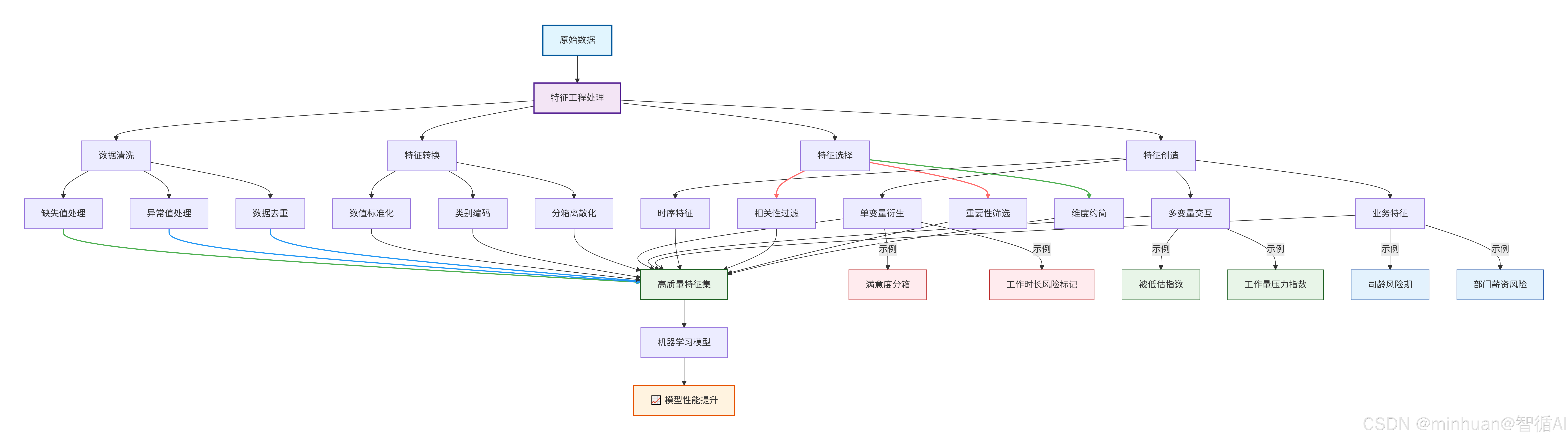 这张图展示了特征工程的本质:通过系统性的数据处理和创造性特征设计,把原始数据"烹饪"成机器学习模型更容易理解和使用的形式。