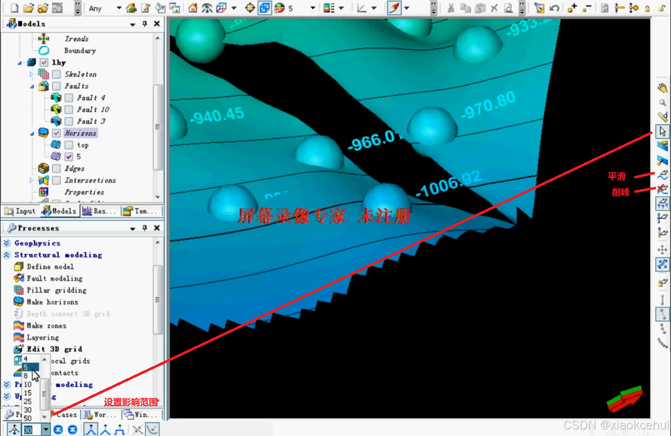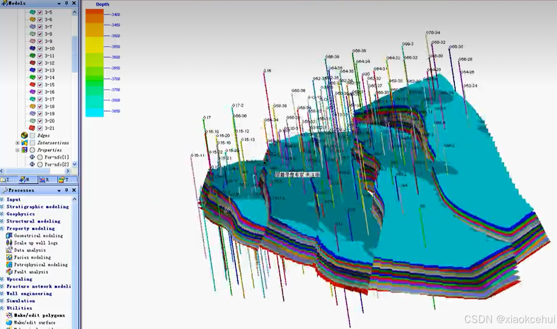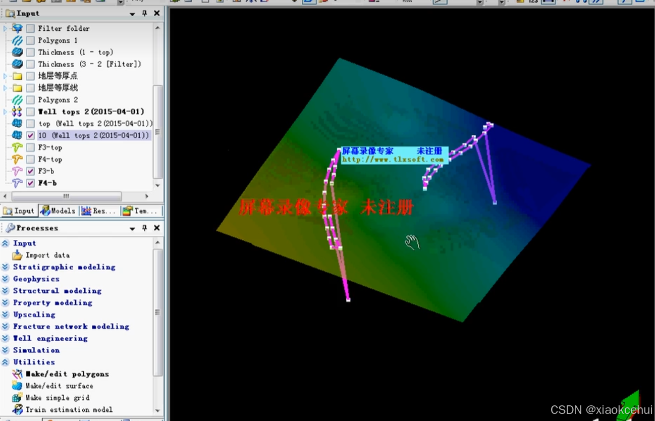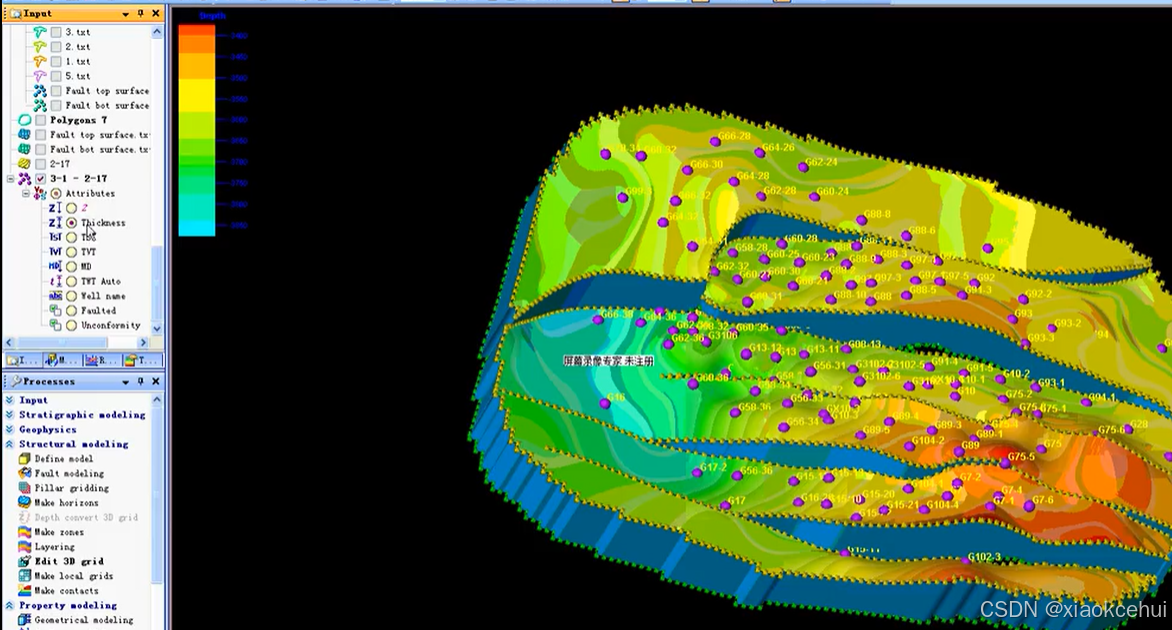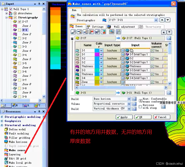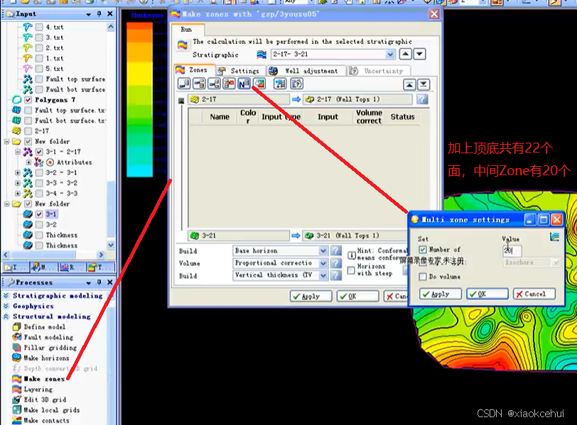 顶底面调整,拉大地层厚度,注意不要影响钻孔位置的面。