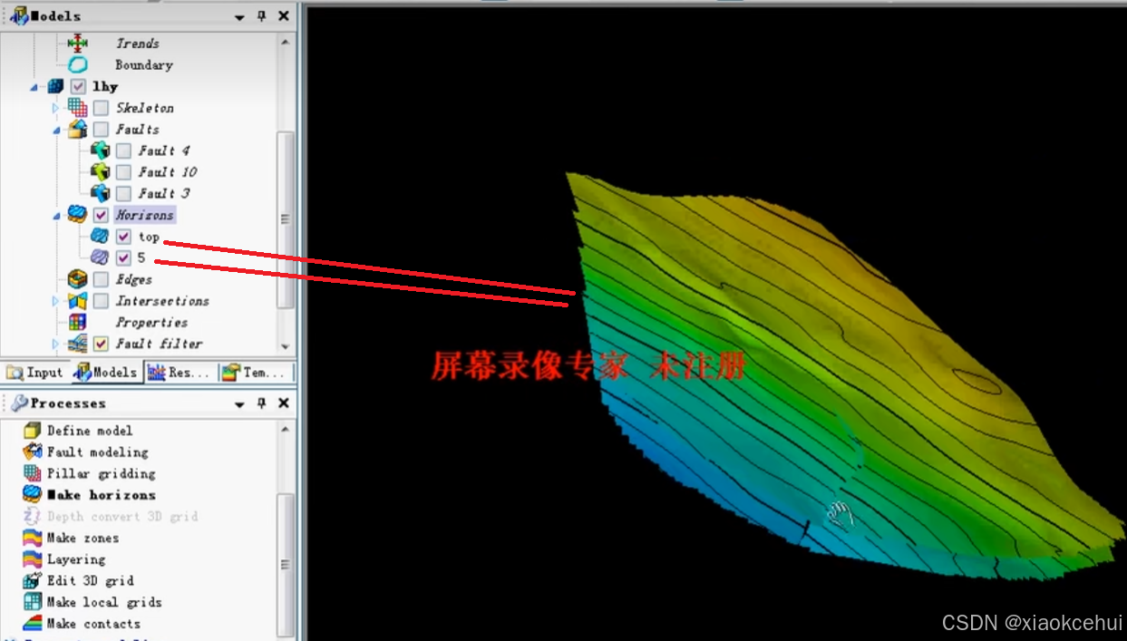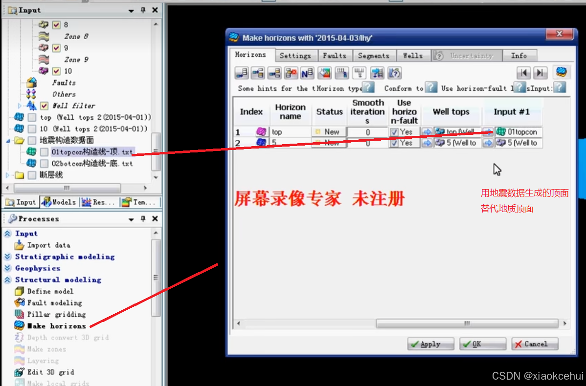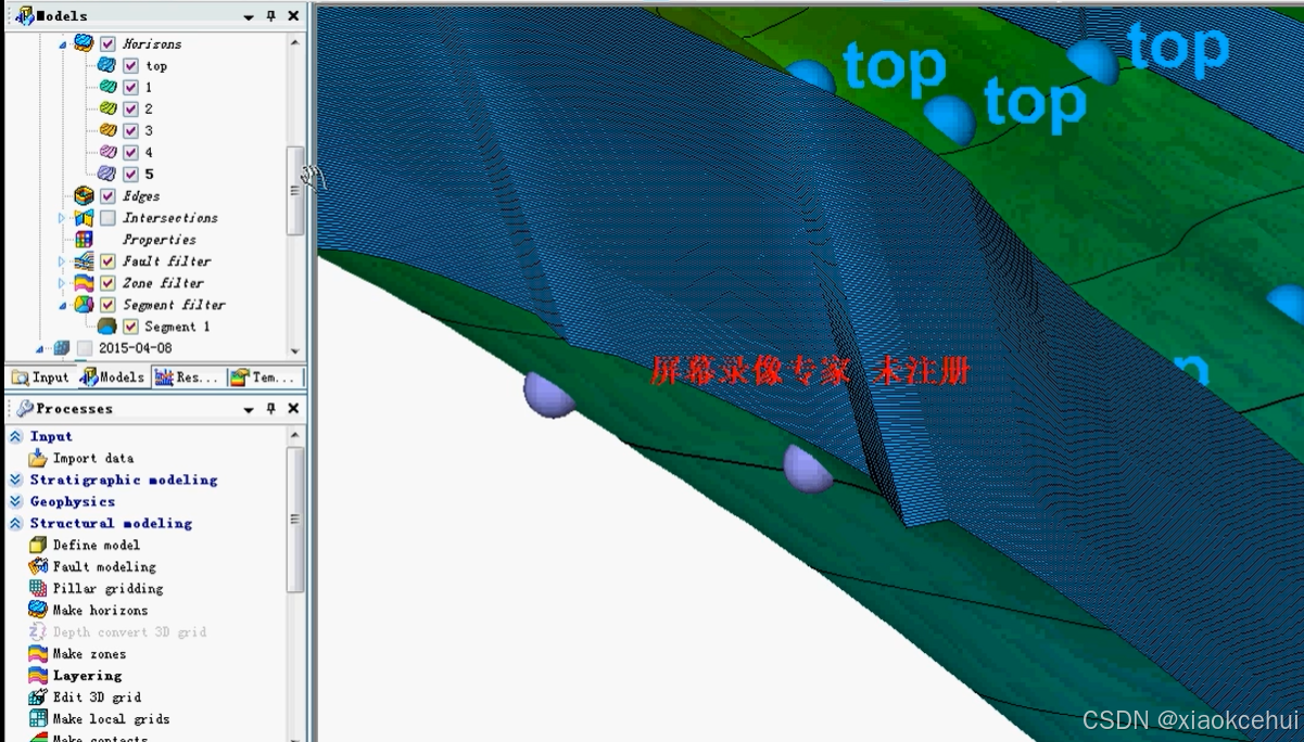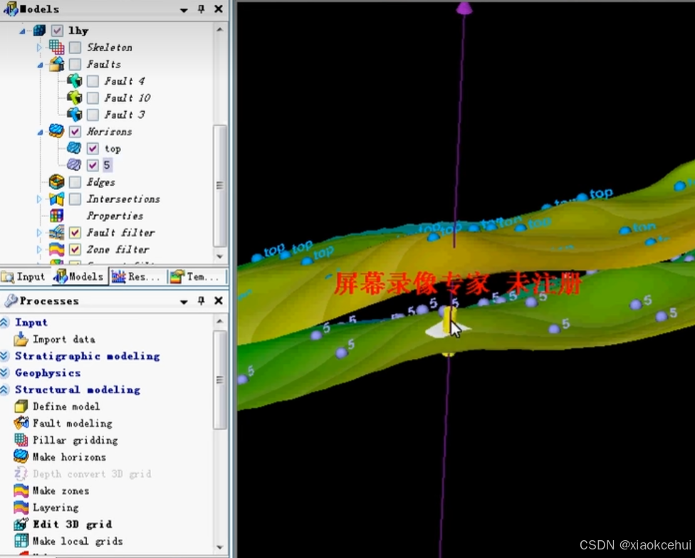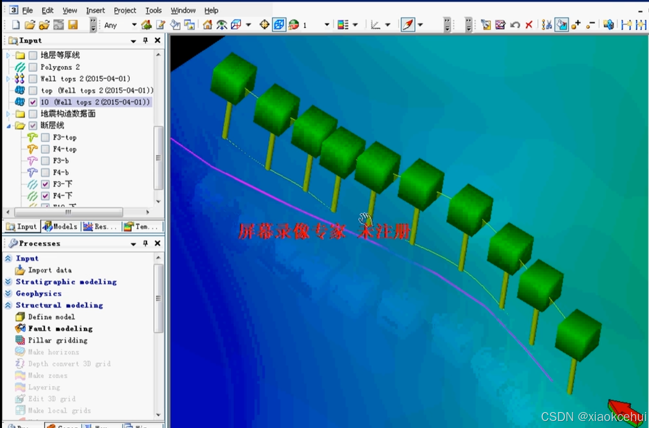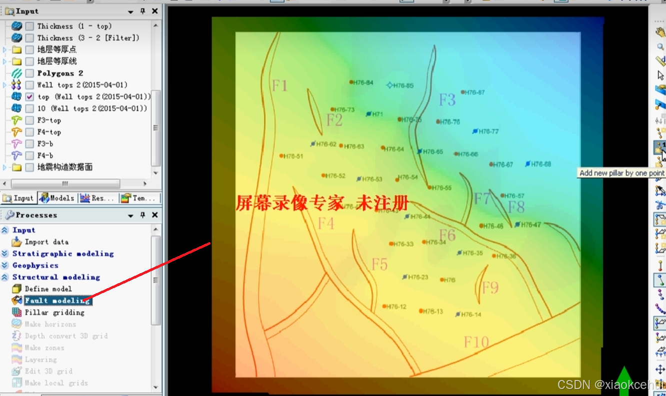 顶底面调整,拉大地层厚度,注意不要影响钻孔位置的面。