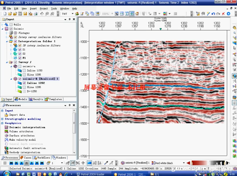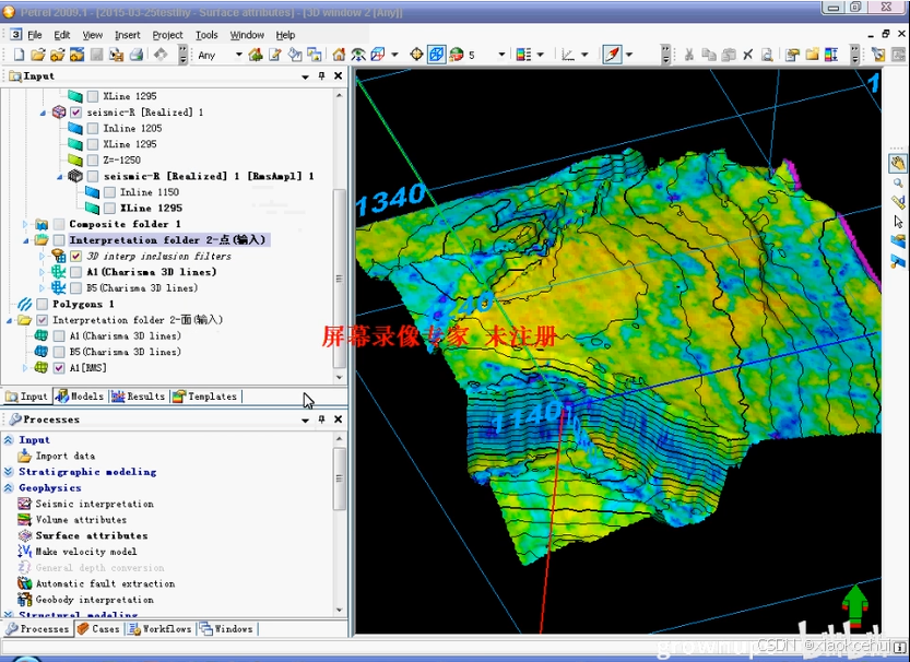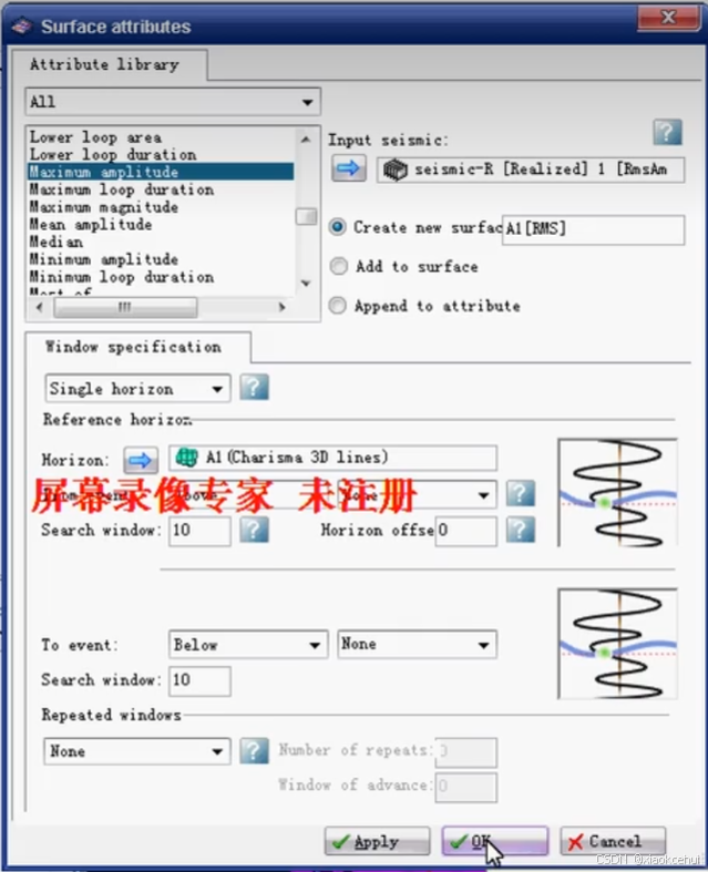 Maximum amplitude,选择三维地震体,命名要输出的面,选择约束面,设定此约束面上下10ms搜索最大振幅值。