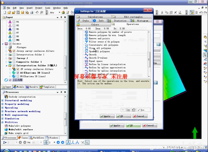 生成面时,若提示边界没有闭合,在Operations面板中先Run,Open all polygons,然后Run,Close all polygons。