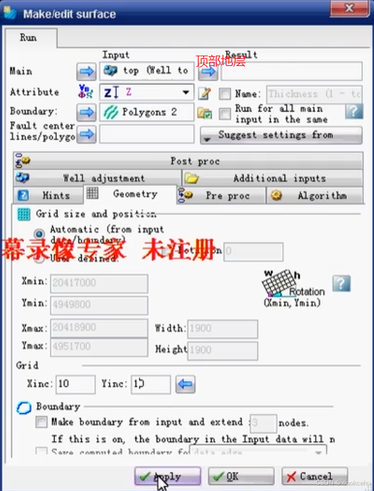 厚度值生成面,格网大小与建模一致。Result如有值,按del键删除。