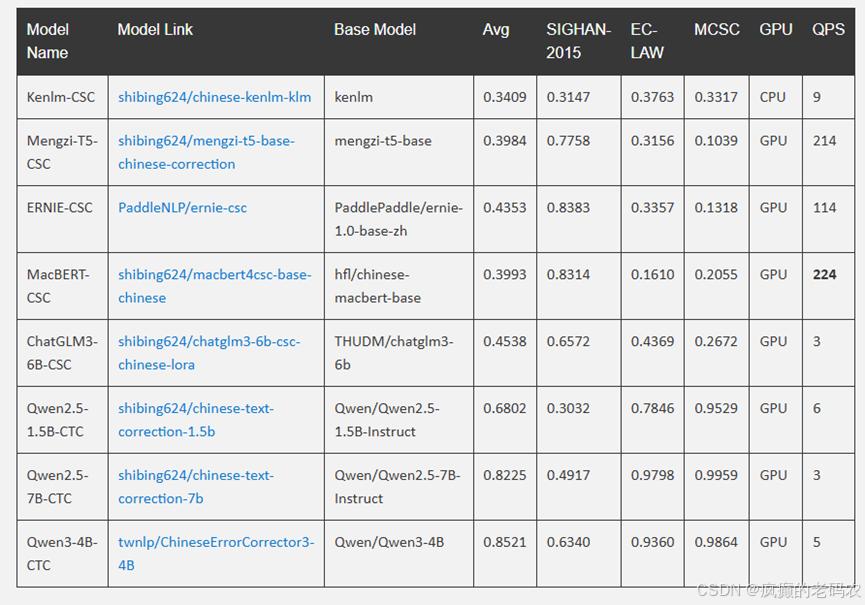 Pycorrector执行对文本纠错是需要依赖模型的,模型列表如下: