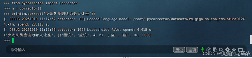 from pycorrector import Correctorm = Corrector()print(m.correct('少先队员因该为老人让坐'))