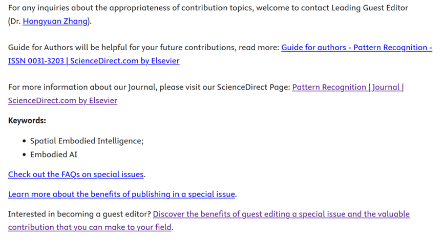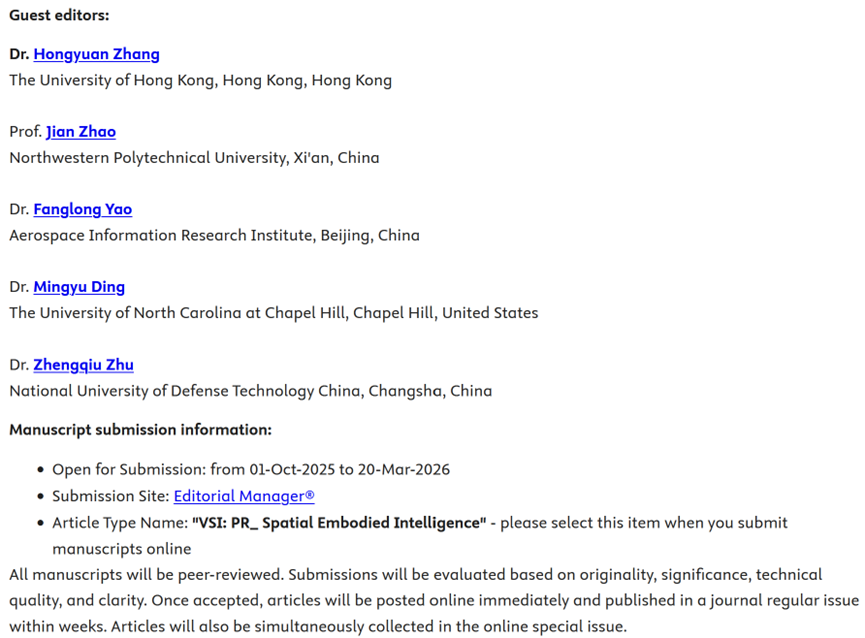 近日,中国电信人工智能研究院(TeleAI)赵健研究员、中国科学院空天信息创新研究院姚方龙副研究员、北卡罗来纳大学教堂山分校Mingyu Ding助理教授、香港大学张鸿远博士(Executive Guest Editor)、国防科技大学朱正秋讲师在中科院一区TOP、CCF-B类推荐期刊《Pattern Recognition》上组织了《开放城市环境下的无人系统空间具身智能》专刊,现公开征集投稿,欢迎大家宣传并赐稿。投稿截止日期为2026年3月20日。