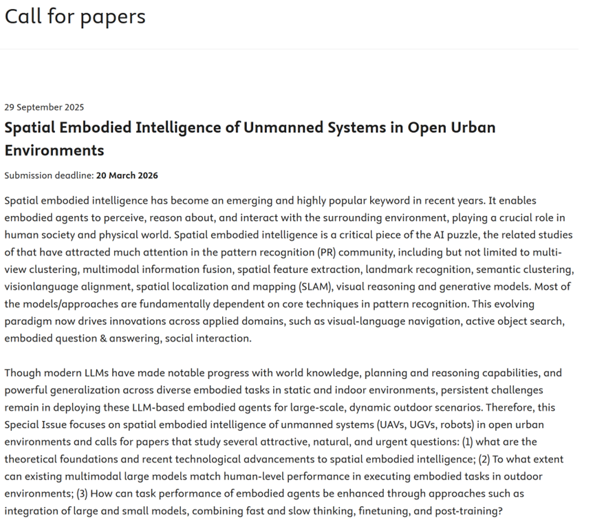 《Pattern Recognition》“开放城市环境下的无人系统空间具身智能”专刊征文通知