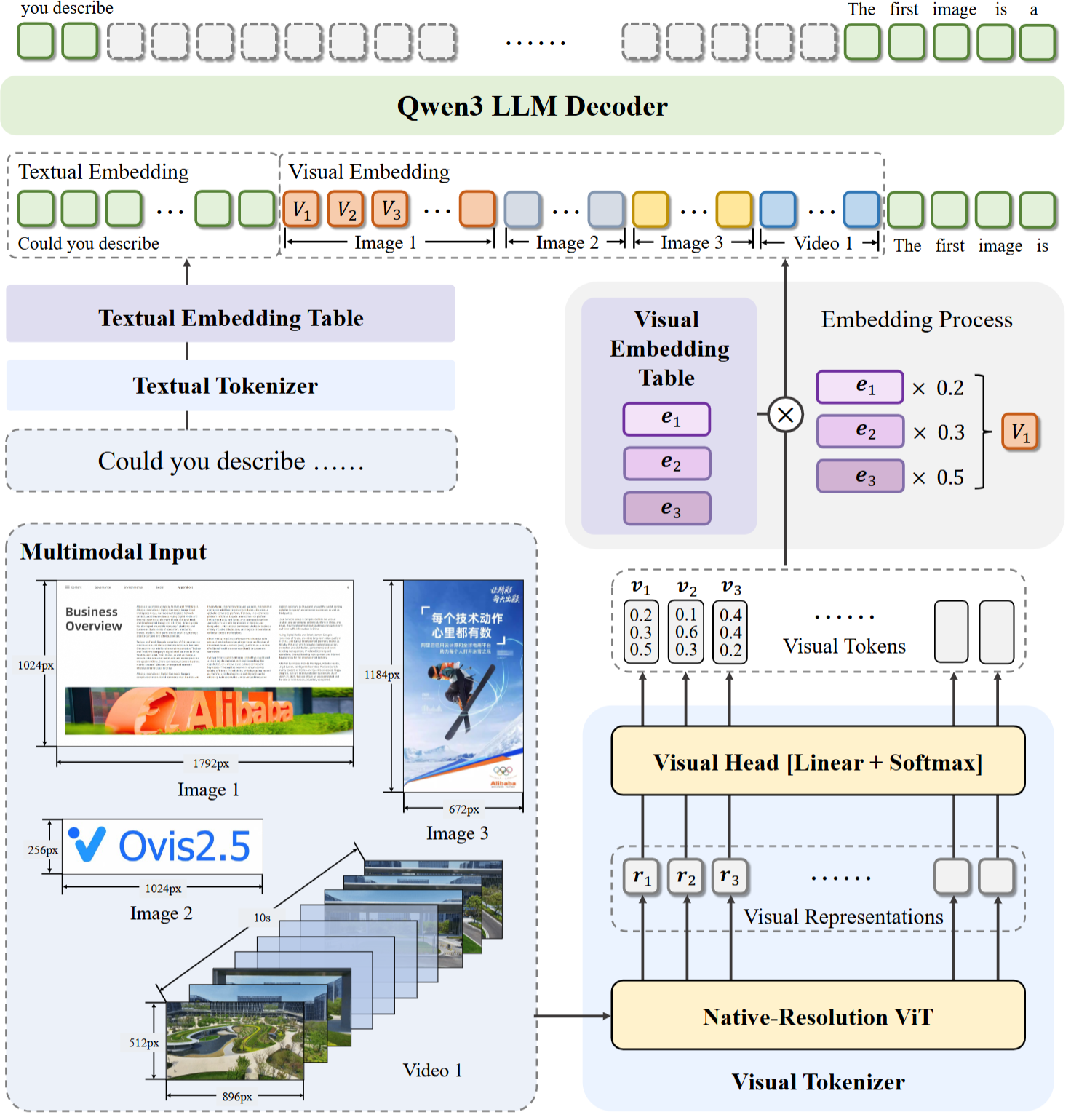 模型的核心架构创新在于加了一个VTE模块,通过结构化嵌入对齐,实现了视觉与语言模态的深度融合,其最显著的特色在于引入了原生分辨率视觉编码器和可切换的“思考模式”。