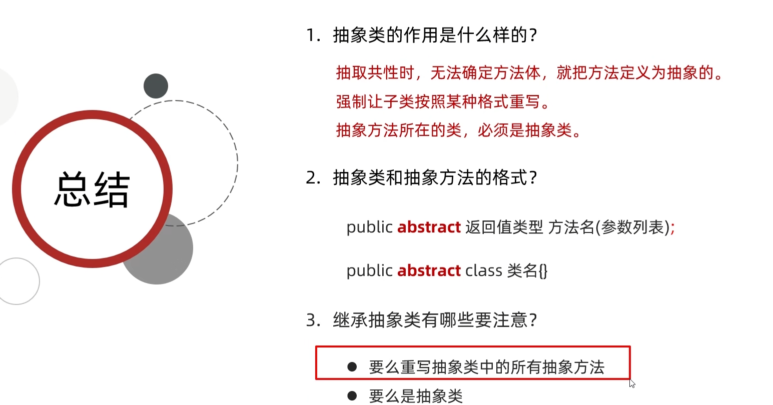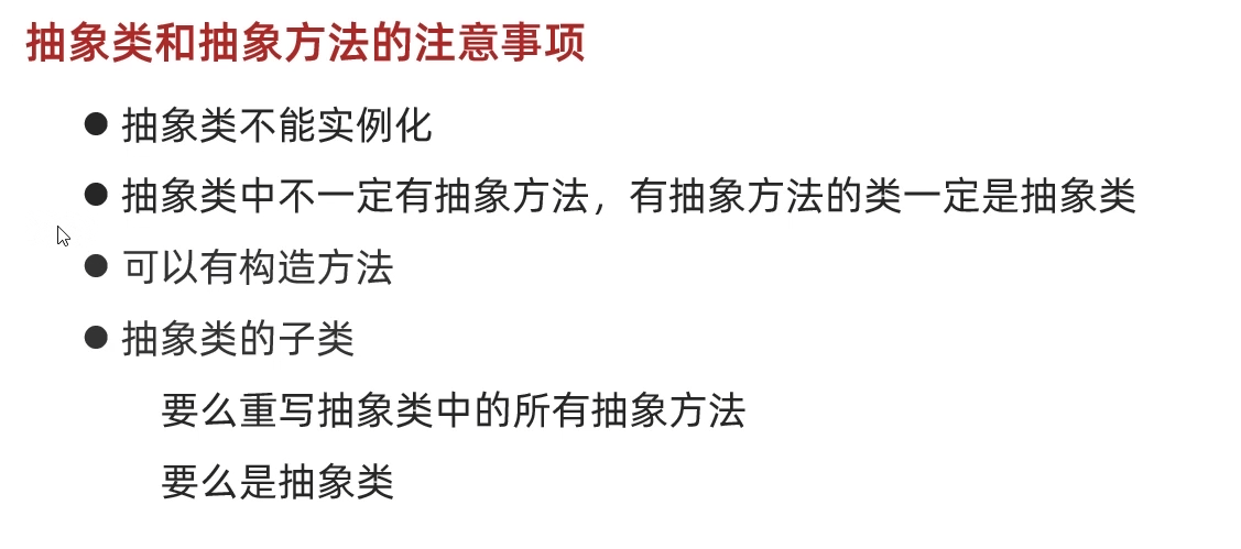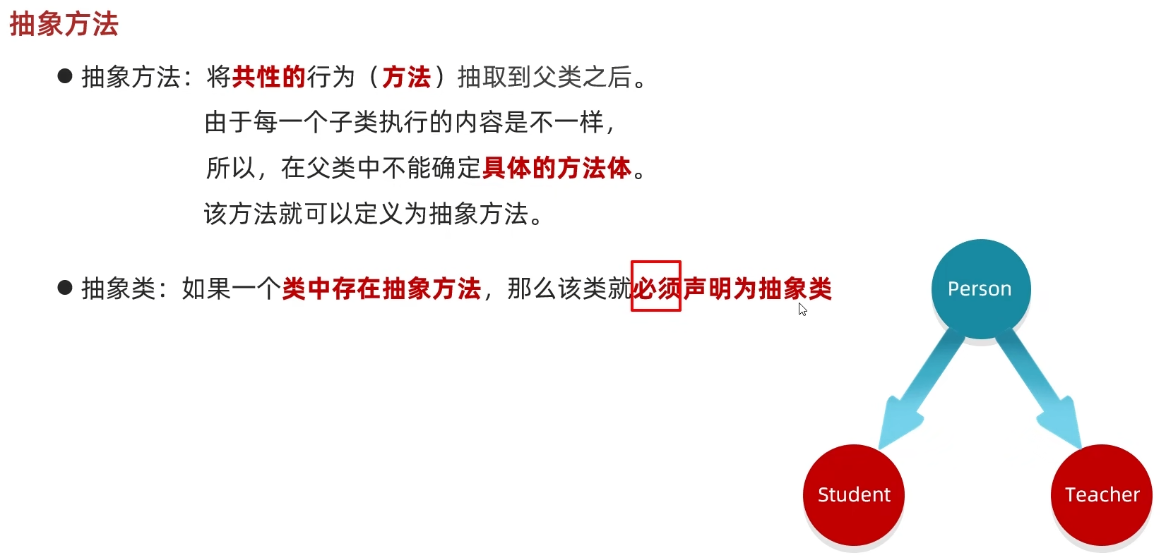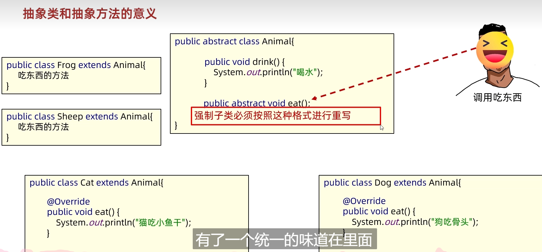 各个子类的相同方法所包含的内容是不一样的,这时候要用到抽象方法。其实和前面的方法重写@Override是一样的,只不过抽象方法能做到强制程序员重写方法