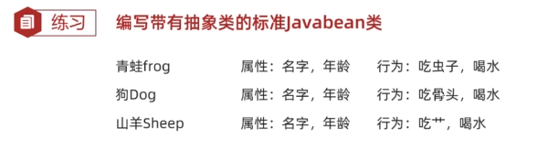package com.abstractclass.demo2;public class Frog extends Animal{public Frog() {}public Frog(String name, int age) {super(name, age);}@Overridepublic void eat() {System.out.println("青蛙在吃虫子");}