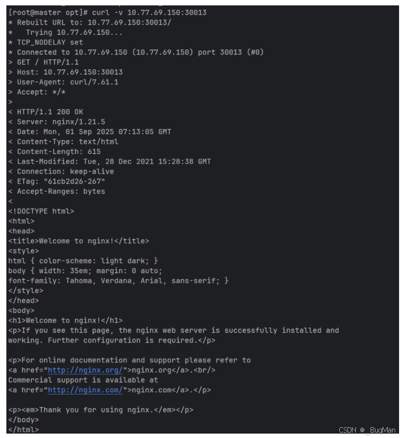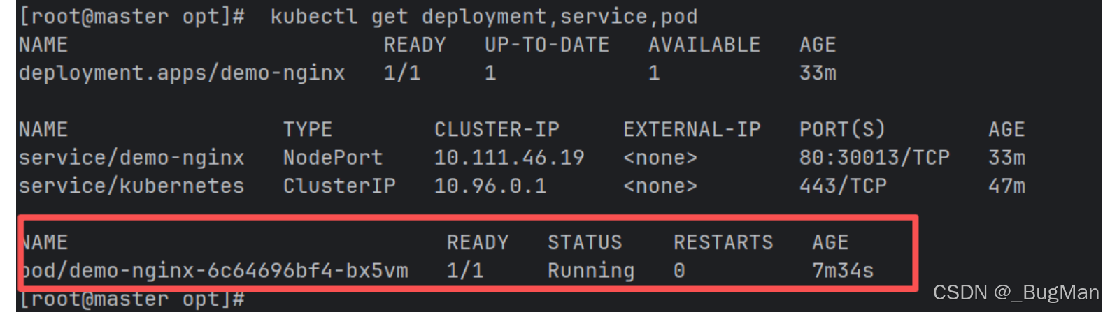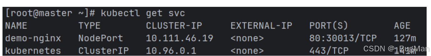 # nginx 服务 apiVersion: v1 kind: Service metadata:name: demo-nginxlabels:app: demo-nginx spec:type: NodePortports:# node port 要求端口大于30000- nodePort: 30013port: 80targetPort: 80protocol: TCPselector:app: demo-nginx --- # nginx 部署 deployment apiVersion: apps/v1 kind: Deployment metadata:name: demo-nginxlabels:app: demo-nginx spec:replicas: 1selector:matchLabels:app: demo-nginxtemplate:metadata:labels:app: demo-nginxspec:containers:- name: demo-nginximage: docker.io/nginx:latestimagePullPolicy: IfNotPresentports:- containerPort: 80resources:requests:memory: "1Gi"cpu: "200m"