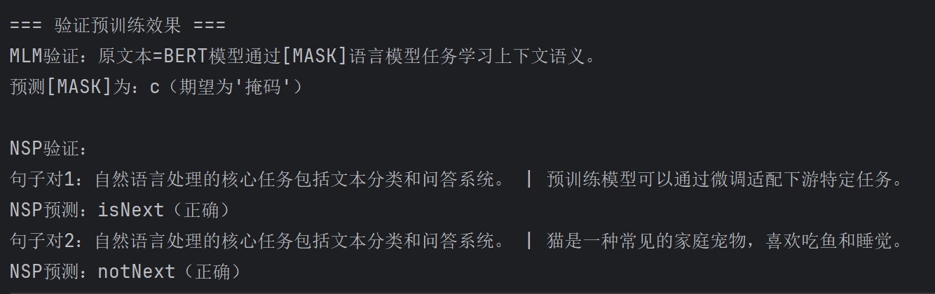 if len(mask_pos) > 0:mask_logits = mlm_logits[0, mask_pos[0], :]predicted_token_id = torch.argmax(mask_logits).item()predicted_token = tokenizer_pretrained.decode([predicted_token_id])print(f"MLM验证:原文本={test_text_mlm}")print(f"预测[MASK]为:{predicted_token}(期望为'掩码')")# -------------------------- NSP验证 --------------------------