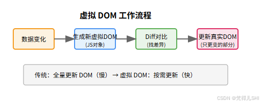 )。当数据变化时,Vue 会先对比新旧虚拟 DOM 的差异(这个过程叫 "Diff"),然后只更新有差异的真实 DOM,而非全量重绘。
