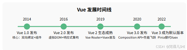 实现响应式、引入 Composition API,解决了 Vue 2 的诸多痛点(如大型项目维护难、TypeScript 支持弱)。 - 2022 年:Vue 3 成为官方默认版本,标志着框架进入成熟稳定期。