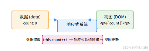 这背后是 Vue 的 "响应式系统",工作流程可简化为:
