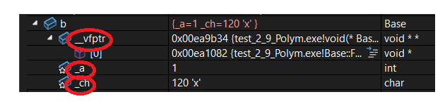 调试一下可以看到,b里面除了成员变量_a和_ch外还有一个_vfptr。_vfptr叫做虚函数表指针,是一个指针类型,在x32环境下,它的大小是4个字节,8+4正好等于我们得到的答案12。
