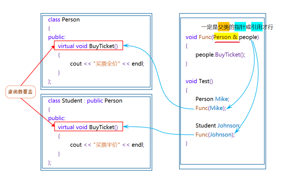 - 被调⽤的函数必须是虚函数,并且虚函数完成了重写/覆盖。