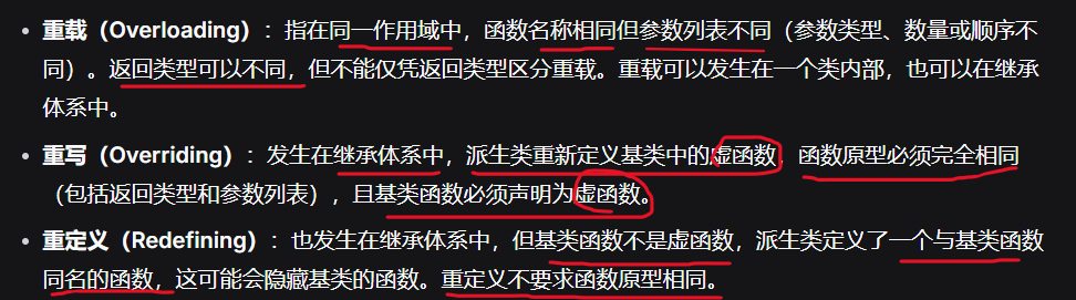 - 如果派生类重写了基类的虚函数,那么派生类的虚函数表中对应的虚函数地址就会被覆盖成重写的新虚函数地址。