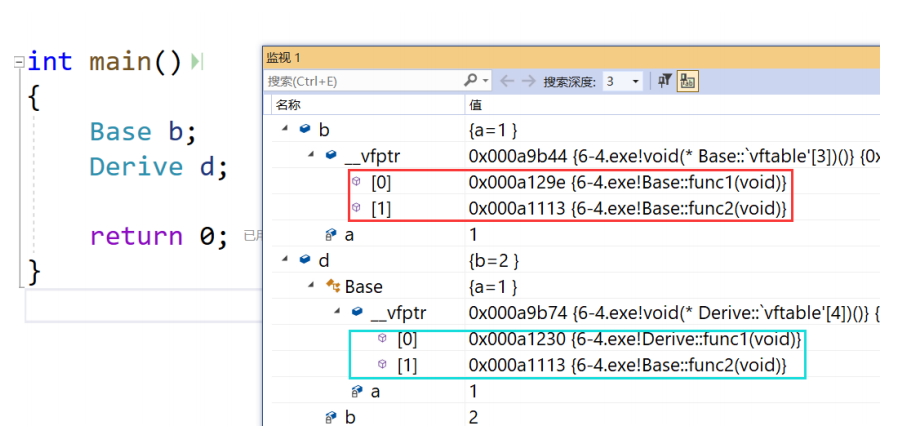 虚函数表就是存放虚函数地址的一个表。【0】就是func1的地址,实际上,对于一个有虚函数的类至少都有一个虚函数表指针,该指针指向一个虚函数表,虚函数表简称虚表,虚函数表指针简称虚表指针!