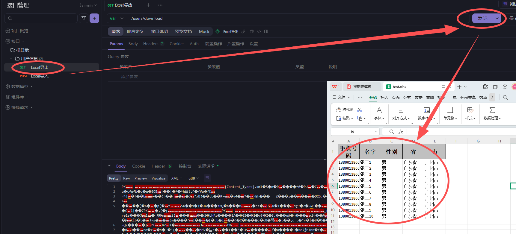 public class UsersController {@Resourceprivate UsersMapper usersMapper;/*** Excel导出** @param response* @throws IOException*/@GetMapping("/download")public void download(HttpServletResponse response) throws IOException {// 设置响应头信息response.setContentType("application/vnd.openxmlformats-officedocument.spreadsheetml.sheet");// 设置编码格式response.setCharacterEncoding("utf-8");// 设置文件名:可以自己自定义String fileName = URLEncoder.encode("数据列表", "UTF-8");response.setHeader("Content-disposition", "attachment;filename*=utf-8''" + fileName + ".xlsx");//获取要导出的数据列表【可行从数据库中获取】List<Users> exportList = new ArrayList<>();for (int i = 1; i <= 10; i++) {Users data = new Users();data.setId(i);data.setTel("1380013800" + i);data.setName("张三" + i);data.setSex("男");data.setProvince("广东省");data.setCity("广州市");exportList.add(data);}// 写入数据FastExcel.write(response.getOutputStream(), Users.class).sheet("模板")// 工作簿名称【可以不写】.excludeColumnFieldNames(Arrays.asList("id"))// 导出忽略某些字段【都导出的话,可以不写】.doWrite(exportList);// 写入数据}/*** Excel导入** @param file* @return 返回响应自行定义,该方法只供参考* @throws IOException*/@PostMapping("/importData")public ResponseEntity<String> importEmp(@RequestParam("file") MultipartFile file) {if (file.isEmpty()) {return ResponseEntity.badRequest().body("请选择一个文件上传!");}try {//读取excel的内容FastExcelReadListener<Users> baseExcelListener = new FastExcelReadListener<>();FastExcel.read(file.getInputStream(), Users.class, baseExcelListener).sheet().doRead();//获取读取的数据列表List<Users> dataList = baseExcelListener.getDataList();//判断是否为空数据if (CollectionUtils.isEmpty(dataList)) {return ResponseEntity.badRequest().body("文件中没有数据!");}//新增数据到数据库的业务逻辑usersMapper.insertBatch(dataList);return ResponseEntity.ok("文件上传并处理成功!");} catch (IOException e) {return ResponseEntity.badRequest().body("文件处理失败!");}}}