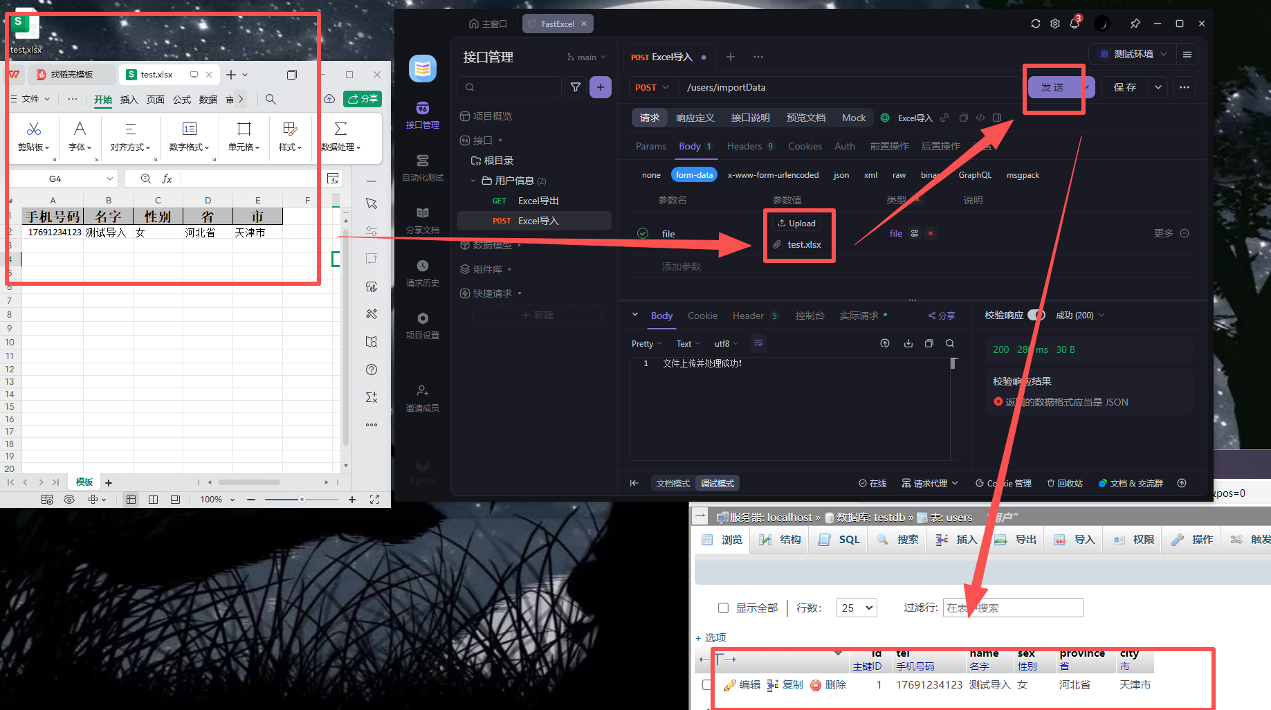 public class Users implements Serializable {private static final long serialVersionUID = 1L;/*** 主键ID*/@Id(keyType = KeyType.Auto)private Integer id;/*** 手机号码*/@ExcelProperty("手机号码")private String tel;/*** 名字*/@ExcelProperty("名字")private String name;/*** 性别*/@ExcelProperty("性别")private String sex;/*** 省*/@ExcelProperty("省")private String province;/*** 市*/@ExcelProperty("市")private String city;}