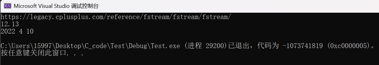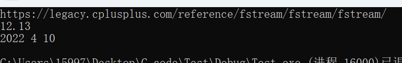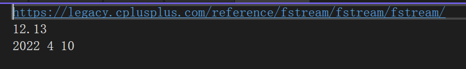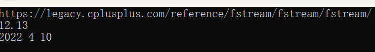 {ServerInfo winfo = { "https://legacy.cplusplus.com/reference/fstream/fstream/fstream/", 12.13, { 2022, 4, 10 } };BinIO bin1;bin1.Write(winfo);ServerInfo rinfo;BinIO bin2;bin2.Read(rinfo);cout << rinfo._address << endl;cout << rinfo._x << endl;cout << rinfo._date << endl;return 0;