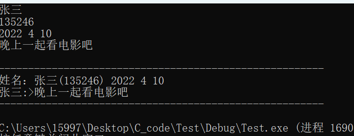 {ChatInfo winfo = { "张三", 135246, { 2022, 4, 10 }, "晚上一起看电影吧" };stringstream oss;oss << winfo._name << endl;oss << winfo._id << endl;oss << winfo._date << endl;oss << winfo._msg << endl;cout << oss.str() << endl;ChatInfo rinfo;string str = oss.str();stringstream iss(str);iss >> rinfo._name >> rinfo._id >> rinfo._date >> rinfo._msg;cout << "-------------------------------------------------------"<< endl;cout << "姓名:" << rinfo._name << "(" << rinfo._id << ") ";cout << rinfo._date << endl;cout << rinfo._name << ":>" << rinfo._msg << endl;cout << "-------------------------------------------------------" << endl;return 0;