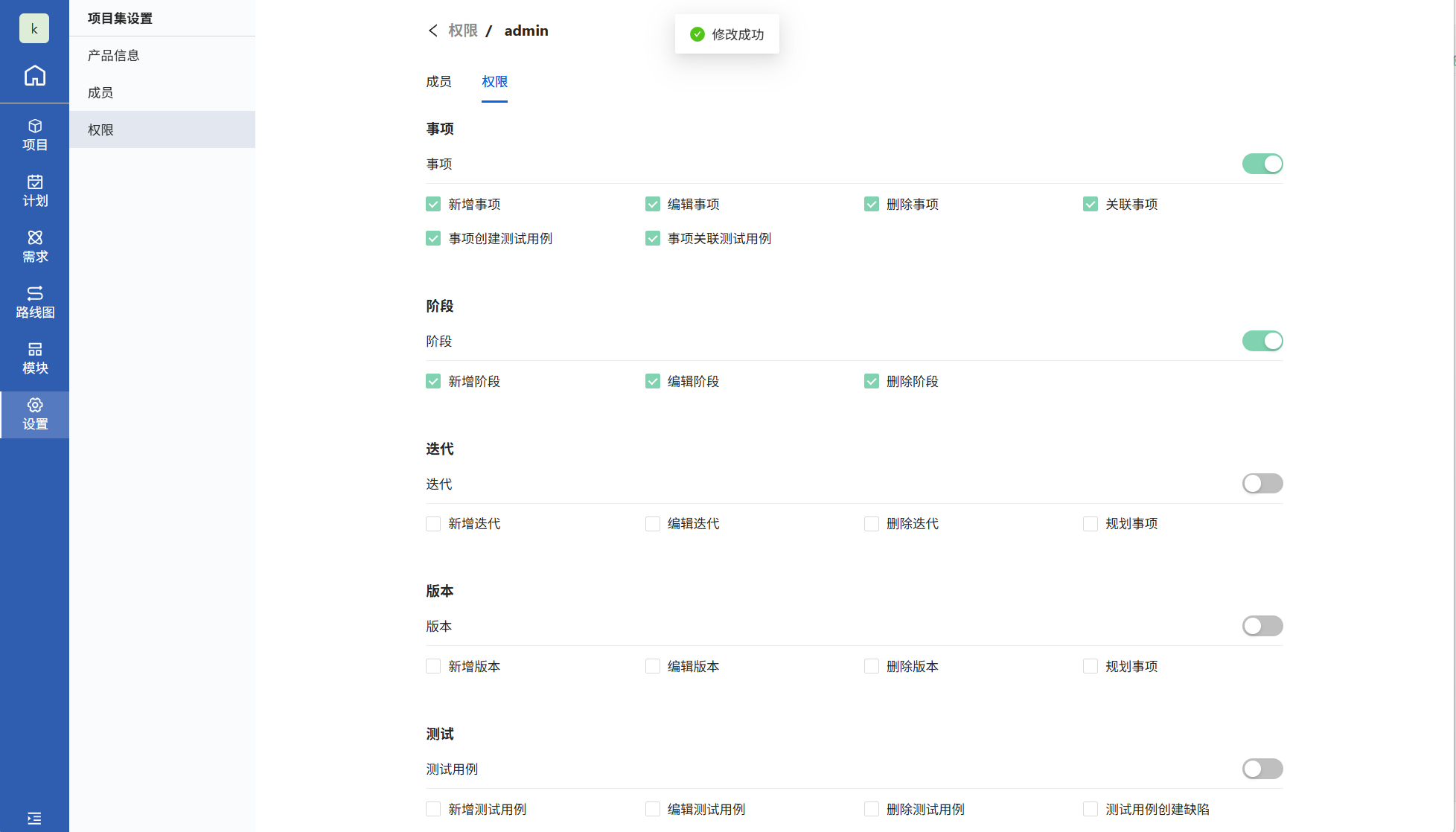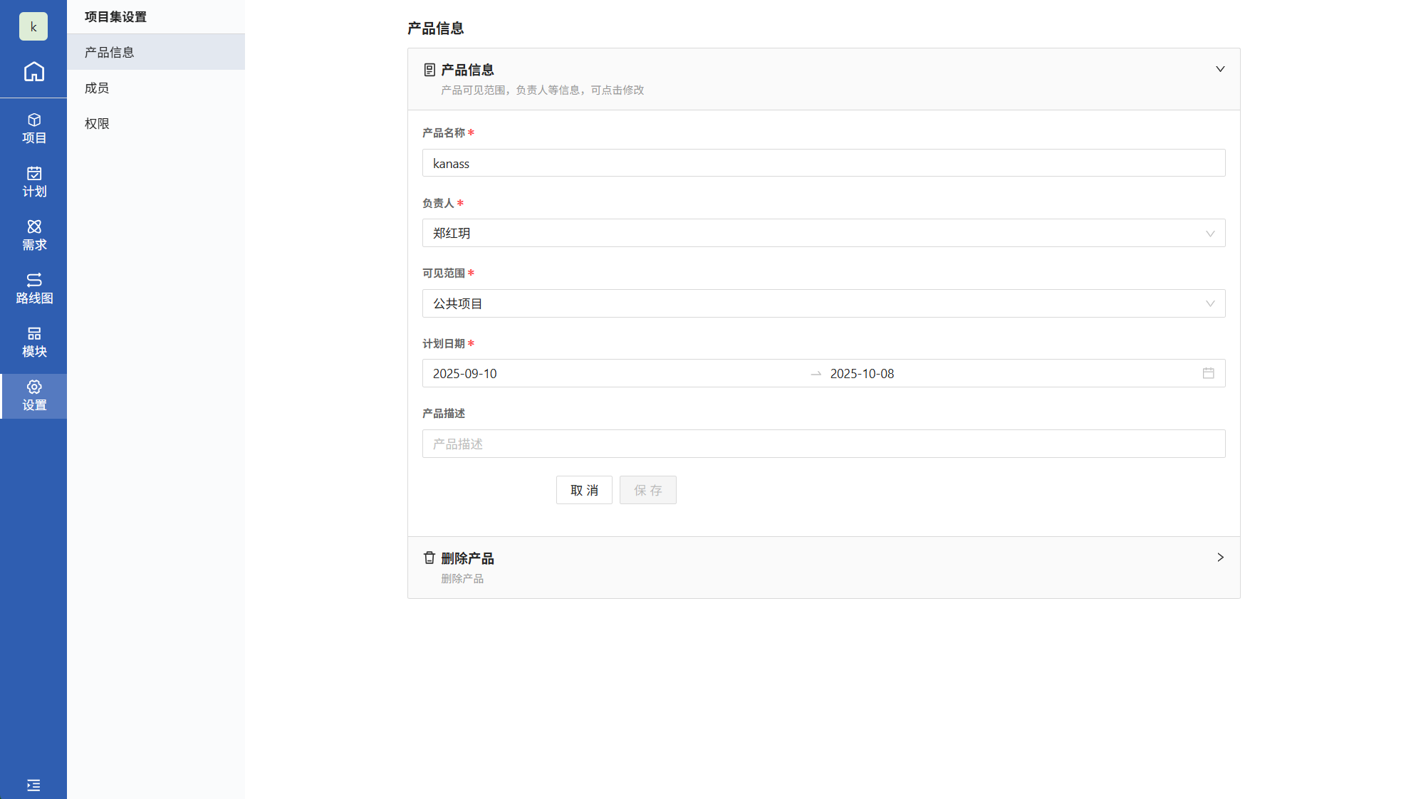 进入产品设置页面,可以修改产品信息、为产品设置成员与权限、删除产品等。