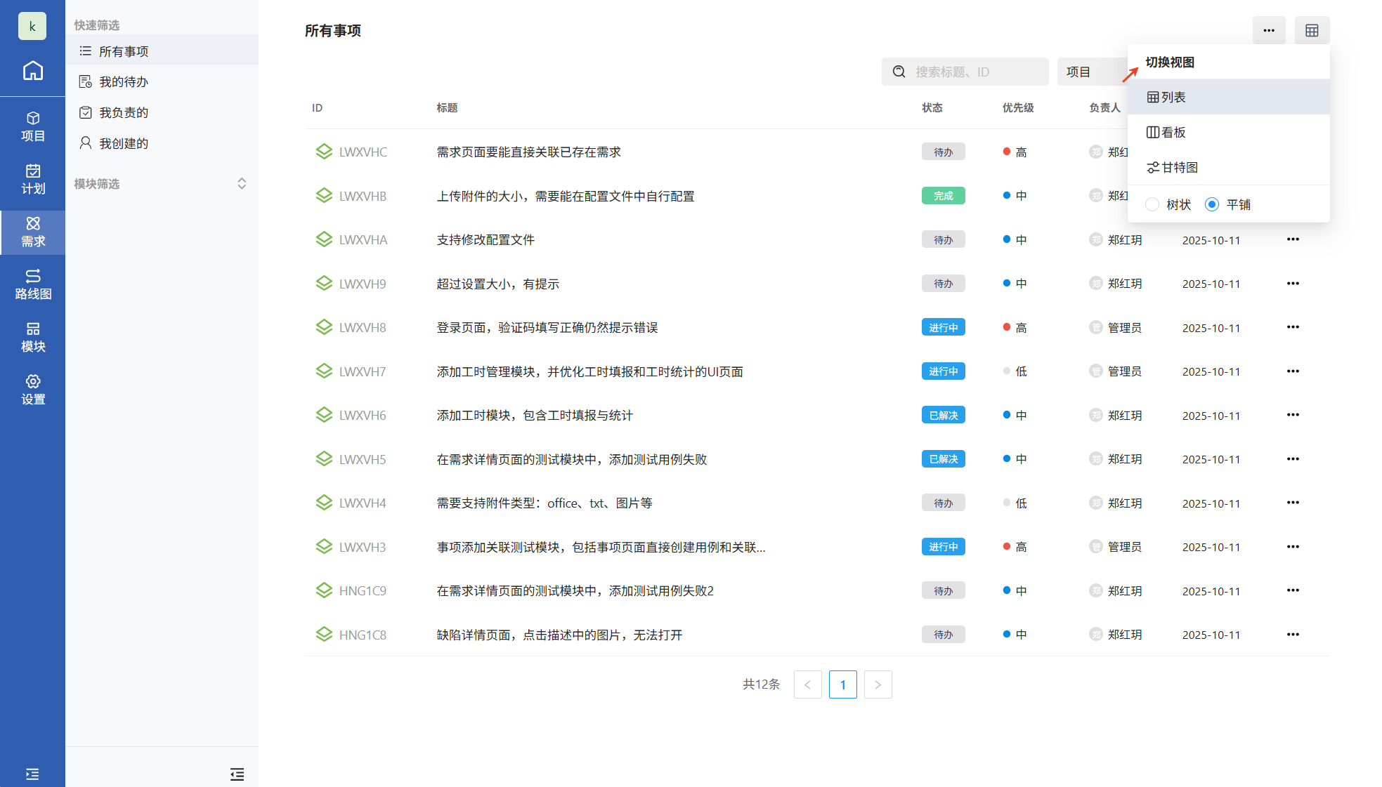 同时需求页面支持切换不同视图查看需求,如列表、看板、甘特图展示