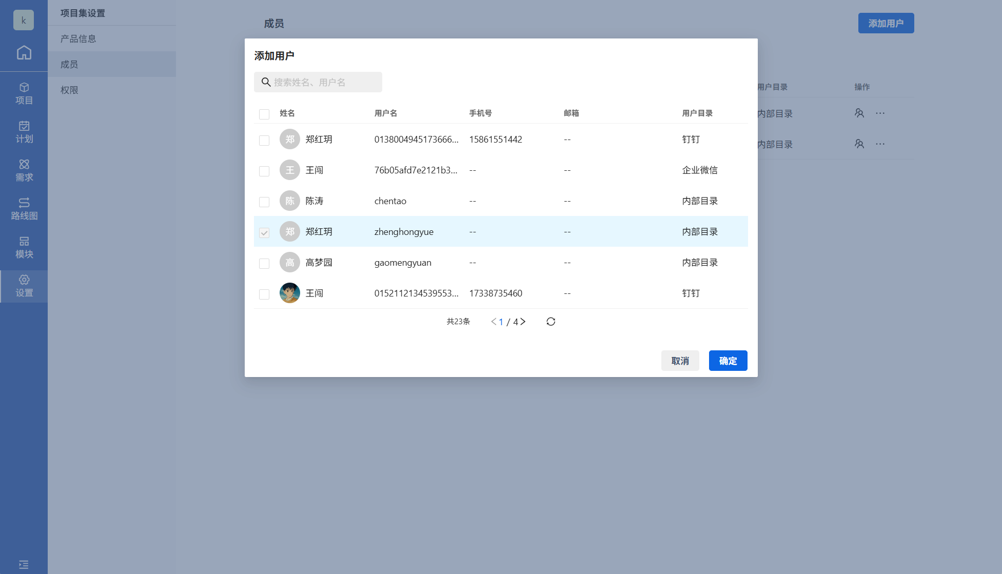 为产品添加成员,需要先在系统中添加用户,然后进入到产品->产品设置->成员->添加用户,勾选已存在的用户
