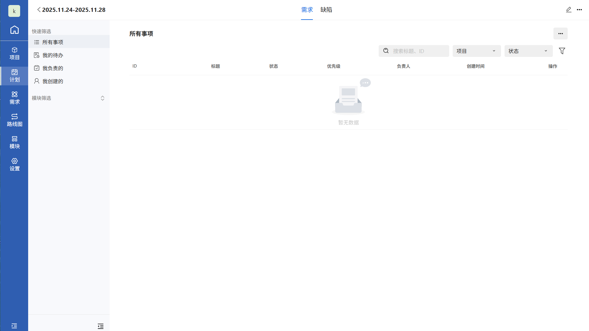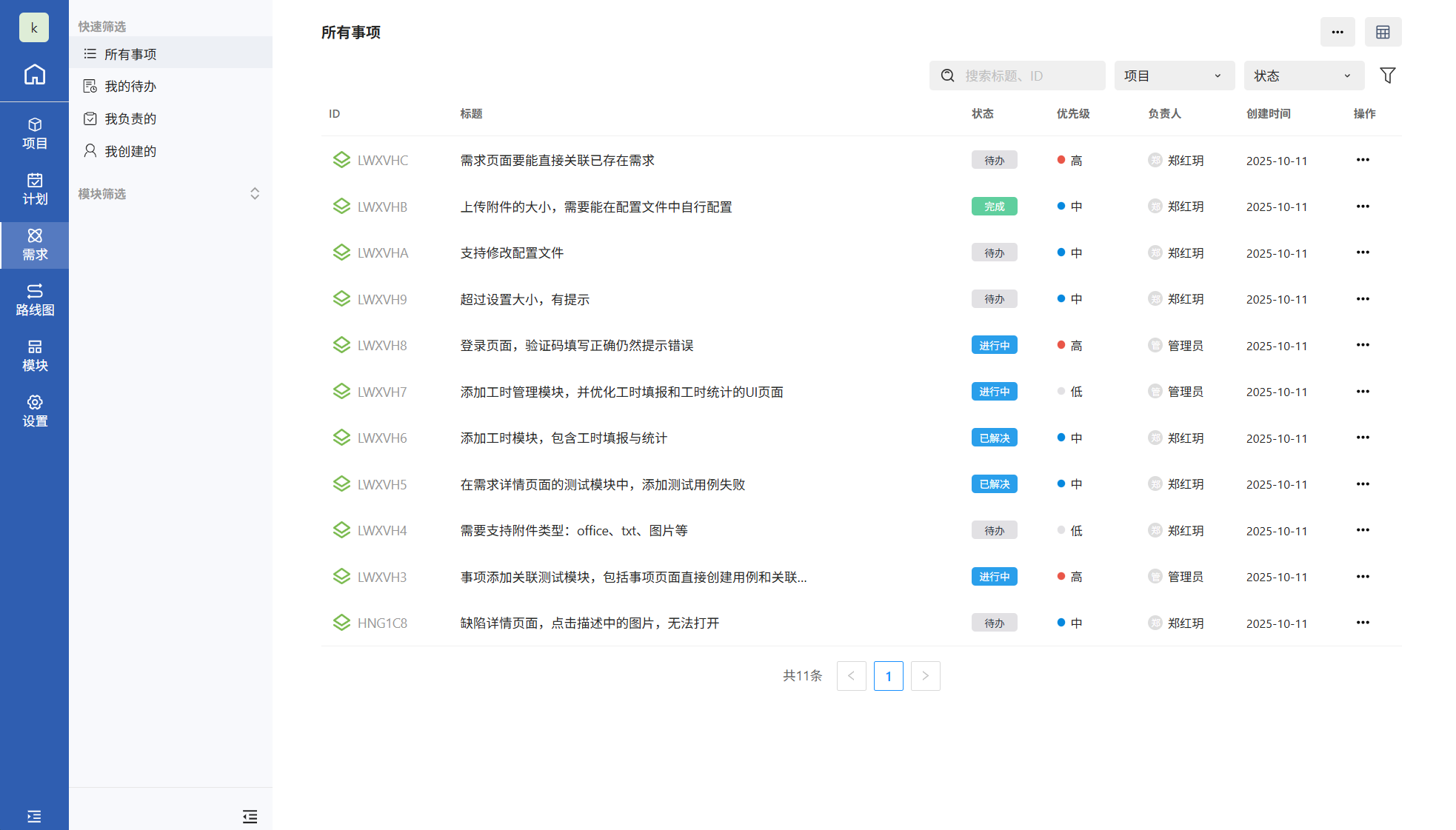 默认显示所有需求,用户可以通过快捷筛选,来查看不同维度的数据,如我的代办、我负责的、我创建的等