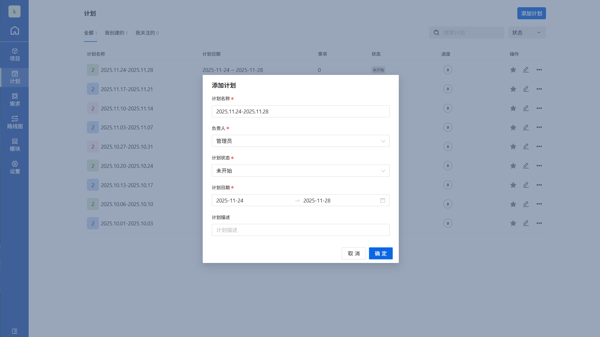进入产品下的计划模块,可以为产品添加计划,用来帮助产品团队从宏观战略到具体执行进行系统性的规划。
